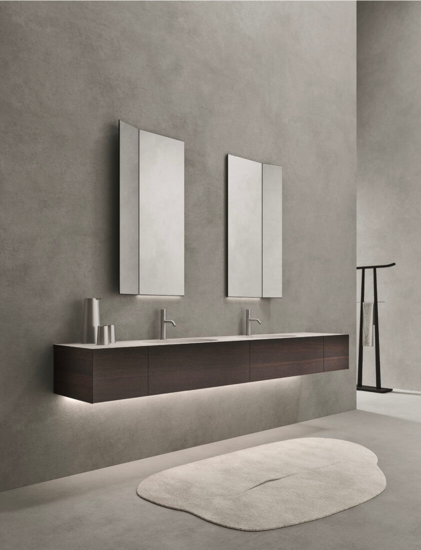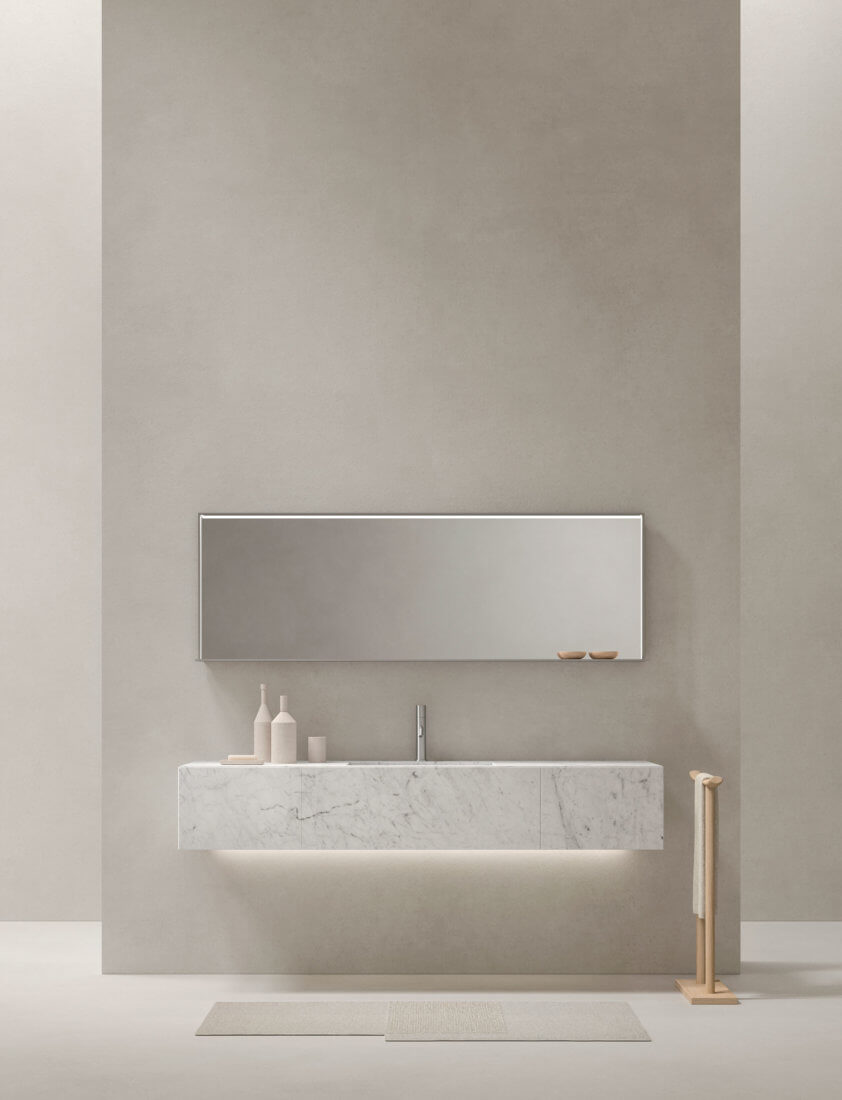 Боковые поверхности умывальников и ванны коллекции Azuma от Milldue, подобно падающей капле воды, переходят от округлой формы верха к квадратному основанию.