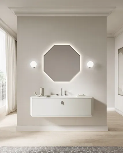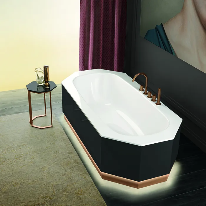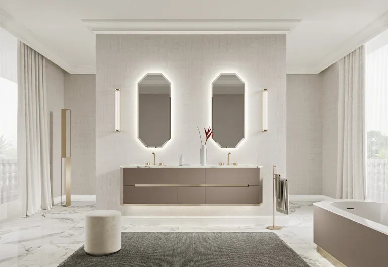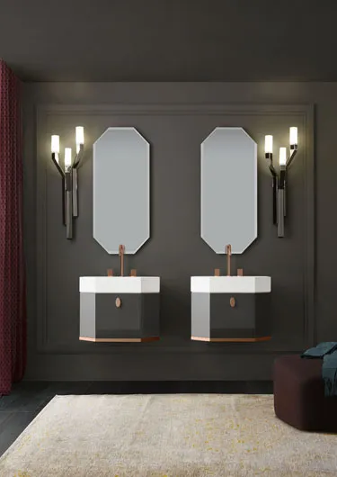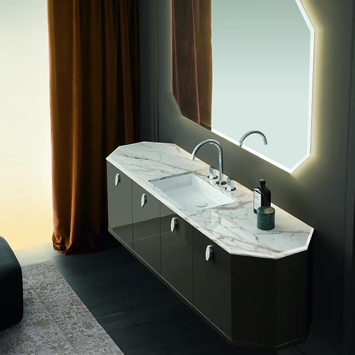 Ценные и инновационные материалы характеризуют новую идею ванной комнаты, в дизайне которой с непринуждённой элегантностью сочетаются изысканные детали и современные геометрические линии конструкции. Характерной отличительной чертой коллекции является объёмная форма, напоминающая алмаз, с изысканной рамой в основании всех элементов обстановки.