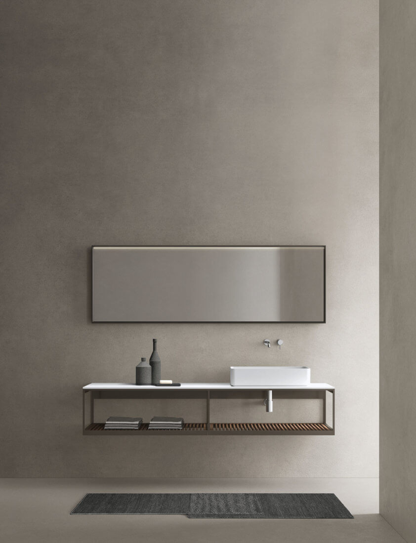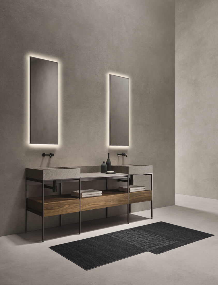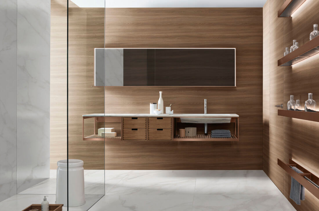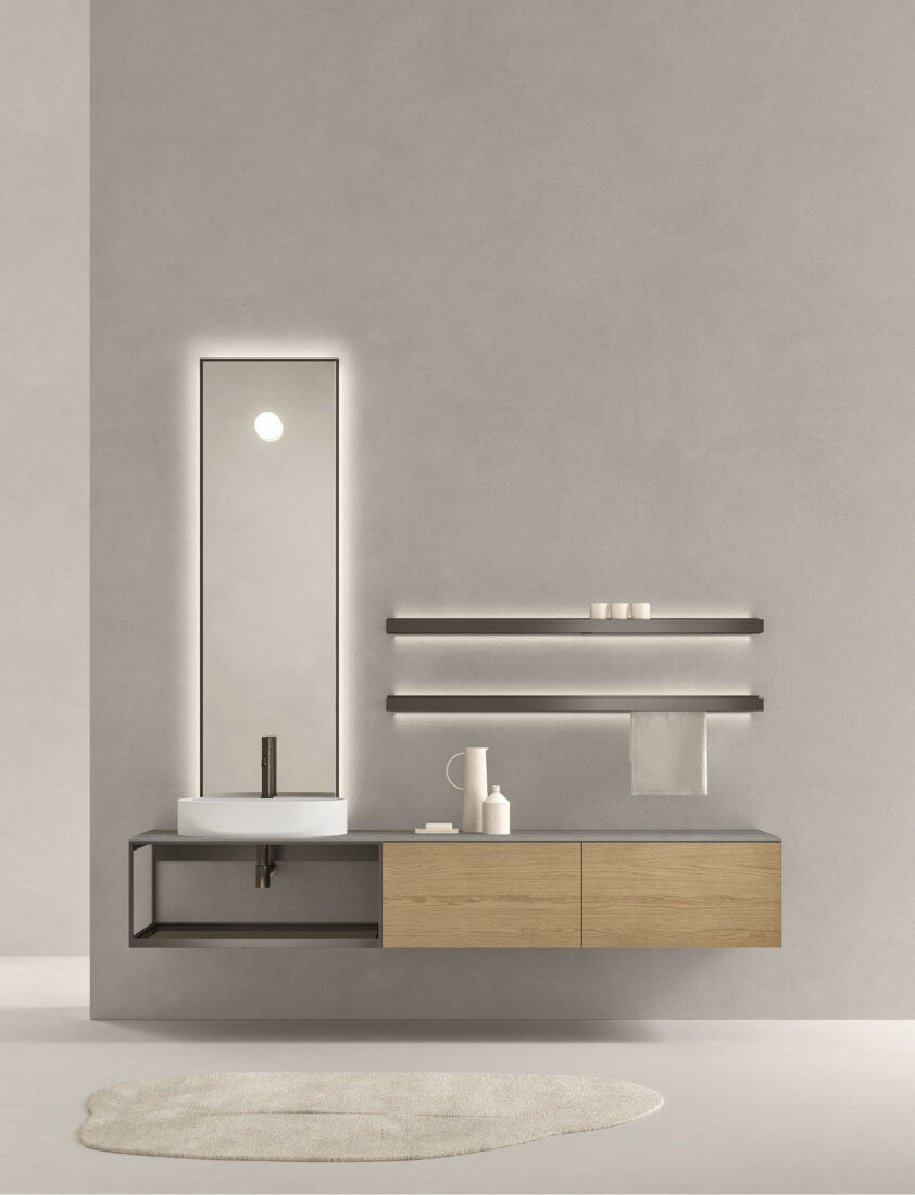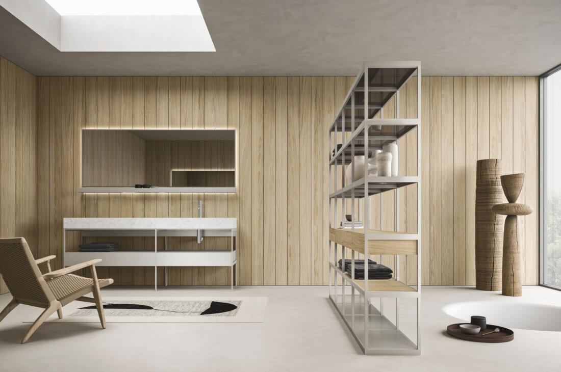 Высокопроизводительная модульная система на основе металлического каркаса, обрамленная рядом облицованных шпоном оснований, шкафами с открытыми фасадами, комодами, полками, столешницами для умывальников, зеркалами и настенными полками.