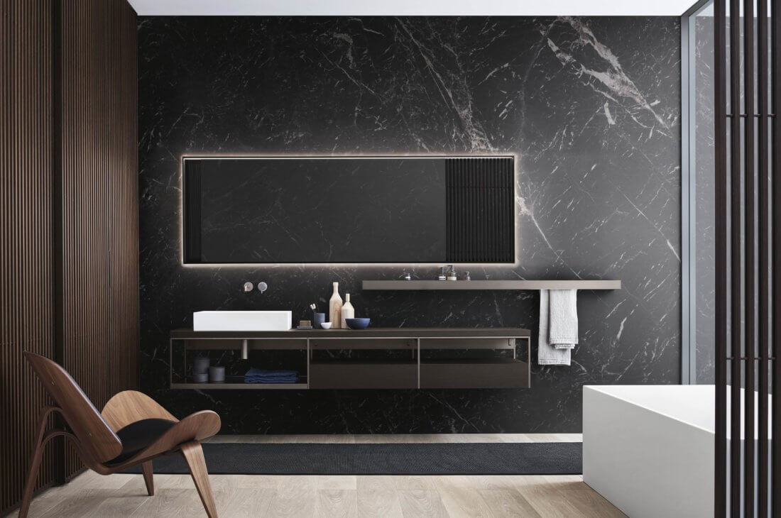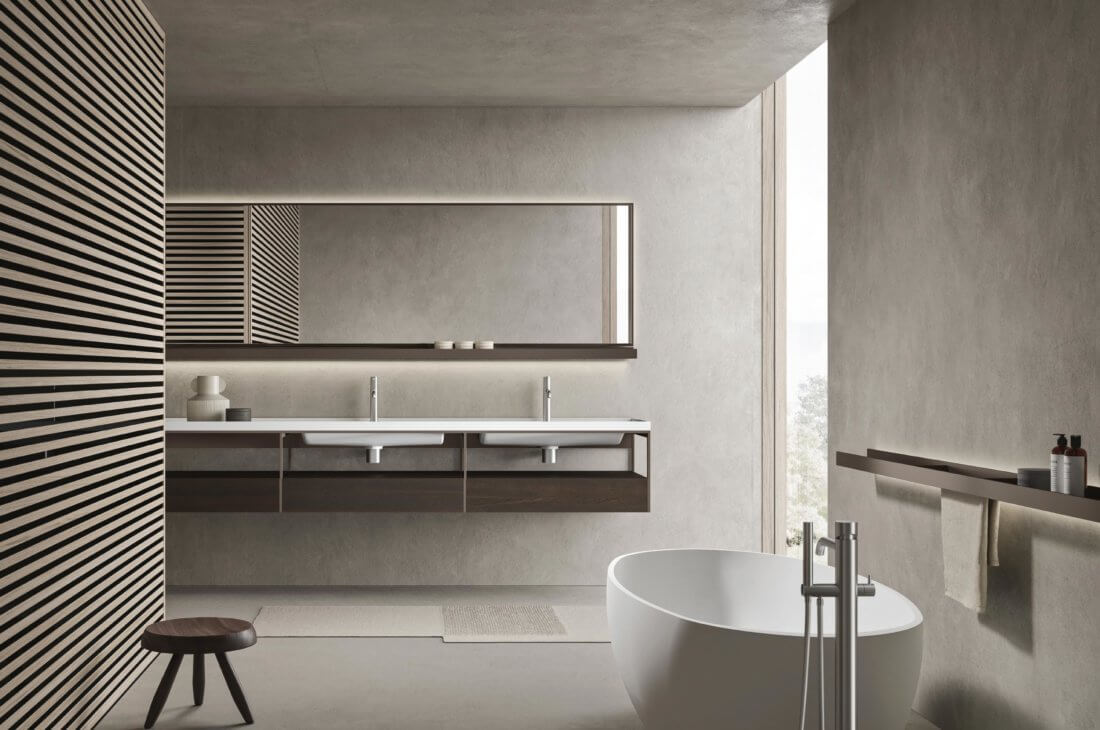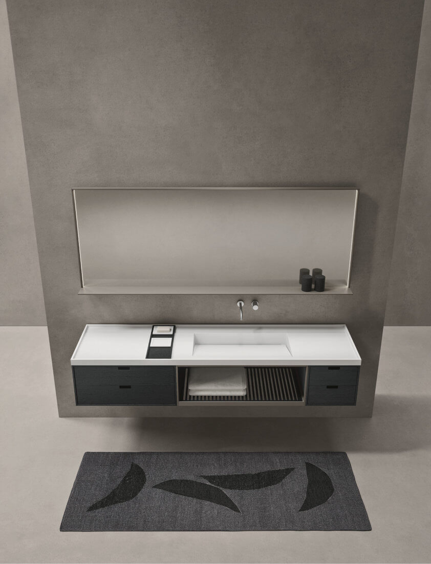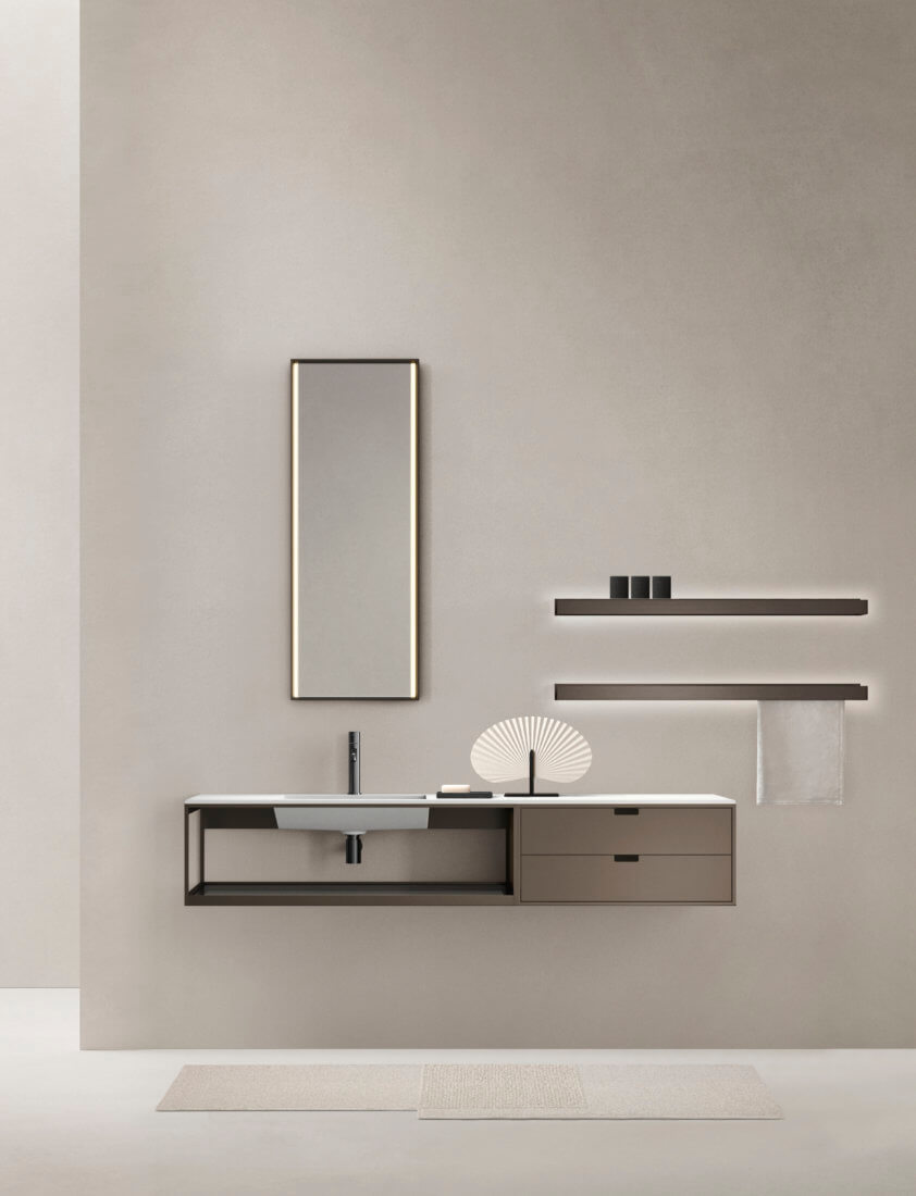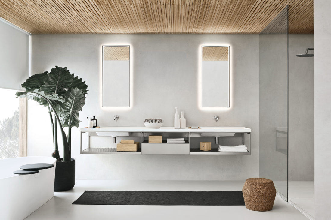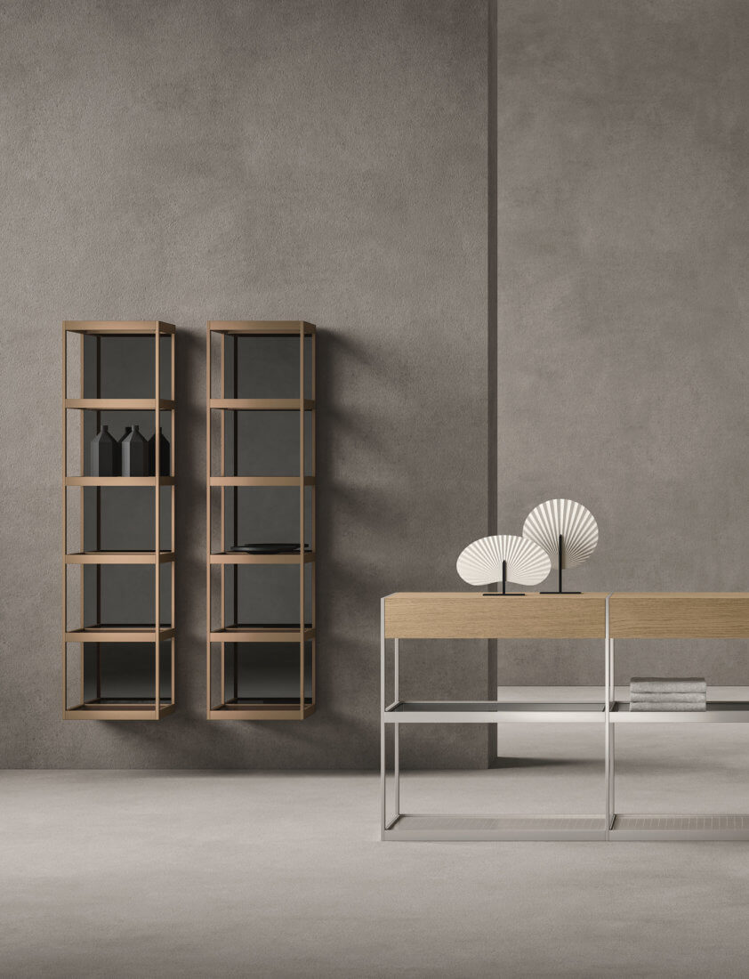 Высокопроизводительная модульная система на основе металлического каркаса, обрамленная рядом облицованных шпоном оснований, шкафами с открытыми фасадами, комодами, полками, столешницами для умывальников, зеркалами и настенными полками.