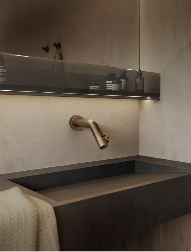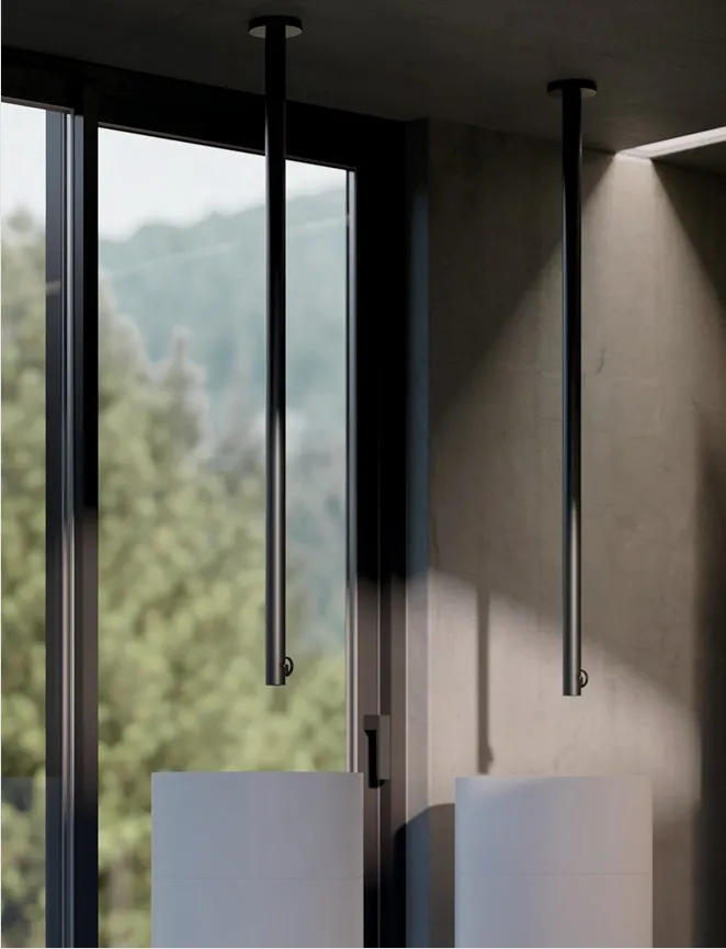 В качестве альтернативы душевой лейке с шарниром в коллекцию Sole также входит настенная лейка со встроенным кронштейном: изготовленная из латуни и доступная во всех вариантах отделки коллекции, она особенно подходит для создания конфигурации очень современной минималистичной душевой.