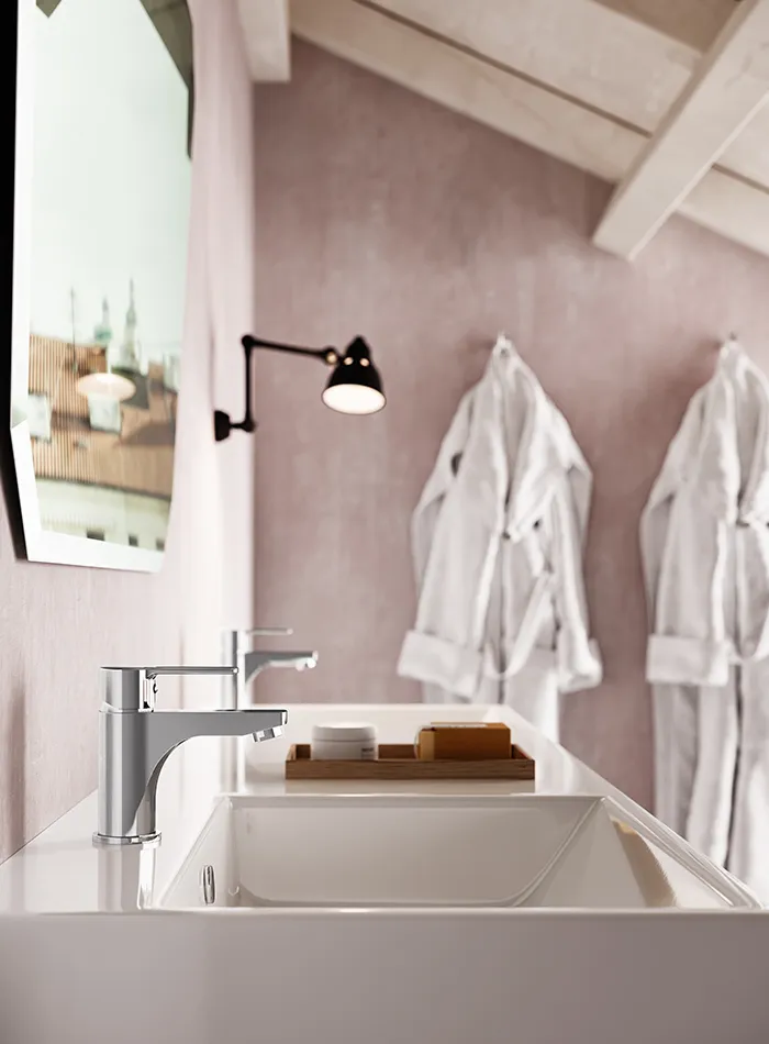 Смеситель для раковины этой серии также доступен с энергосберегающим картриджем, благодаря которому вы можете добиться двойной экономии энергии: открытие рычага до первого положения позволяет подавать только холодную воду в небольшом количестве, в то время как для получения горячей воды необходимо повернуть рычаг влево и вправо. для увеличения расхода необходимо поднять рычаг выше уровня ECO-STOP.