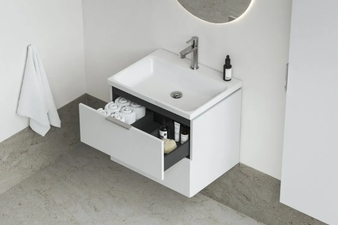 Керамический умывальник коллекции Comfort от Ravak, незначительно выступающий над тумбой, не утяжеляет общий вид и вместе с тумбой создает облегченное впечатление.