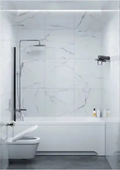 На ровном дне ванны можно комфортно и безопасно стоять во время принятия душа, для защиты от брызг рекомендуется установить стеклянную душевую штору.