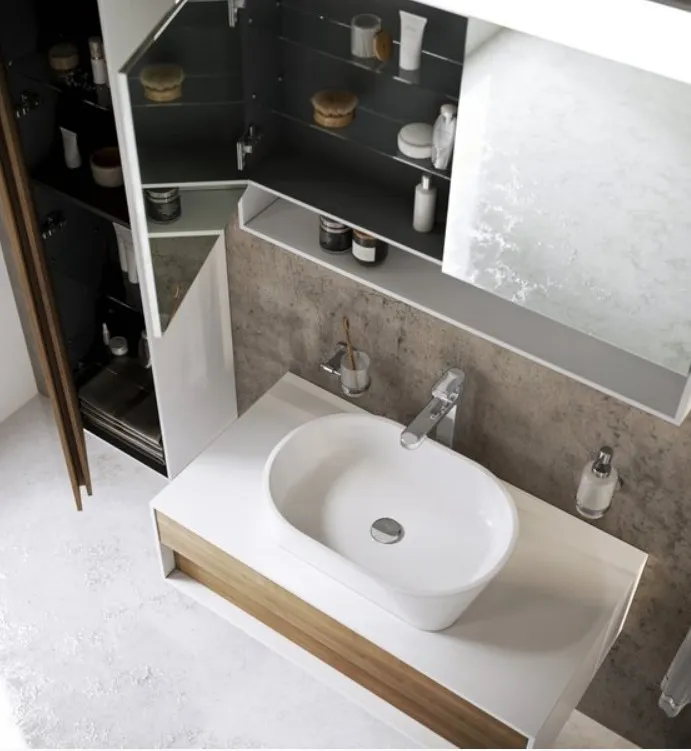 Зеркальный открывающийся шкафчик со светодиодной подсветкой. Дверь оборудована зеркалами снаружи и внутри. Шкафчик предлагает практичную полку в нижней части, внутри он оснащен еще двумя стеклянными полками.
