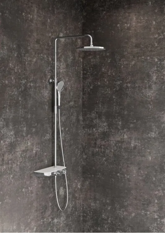 Душевая система Termo от Ravak оснащена термостатическим настенным смесителем, полкой, а также верхним и ручным душем с тремя функциями.