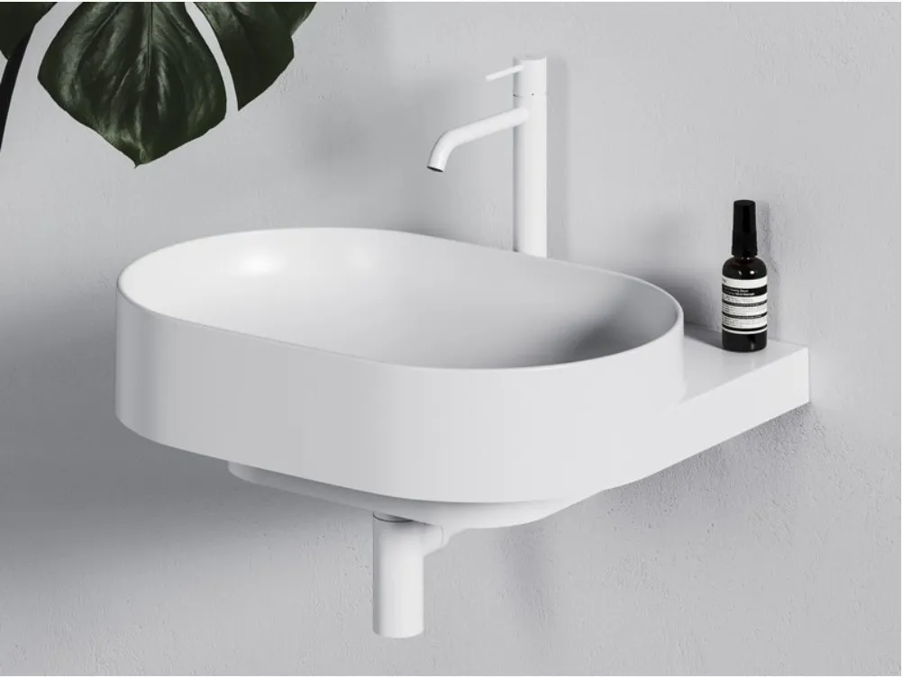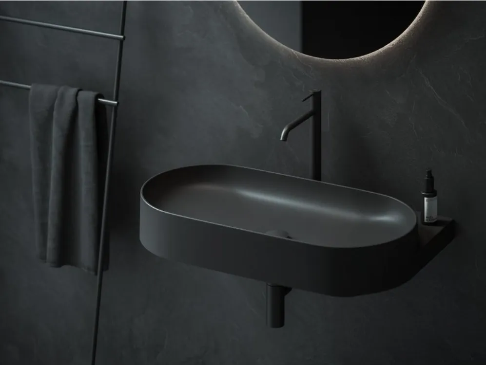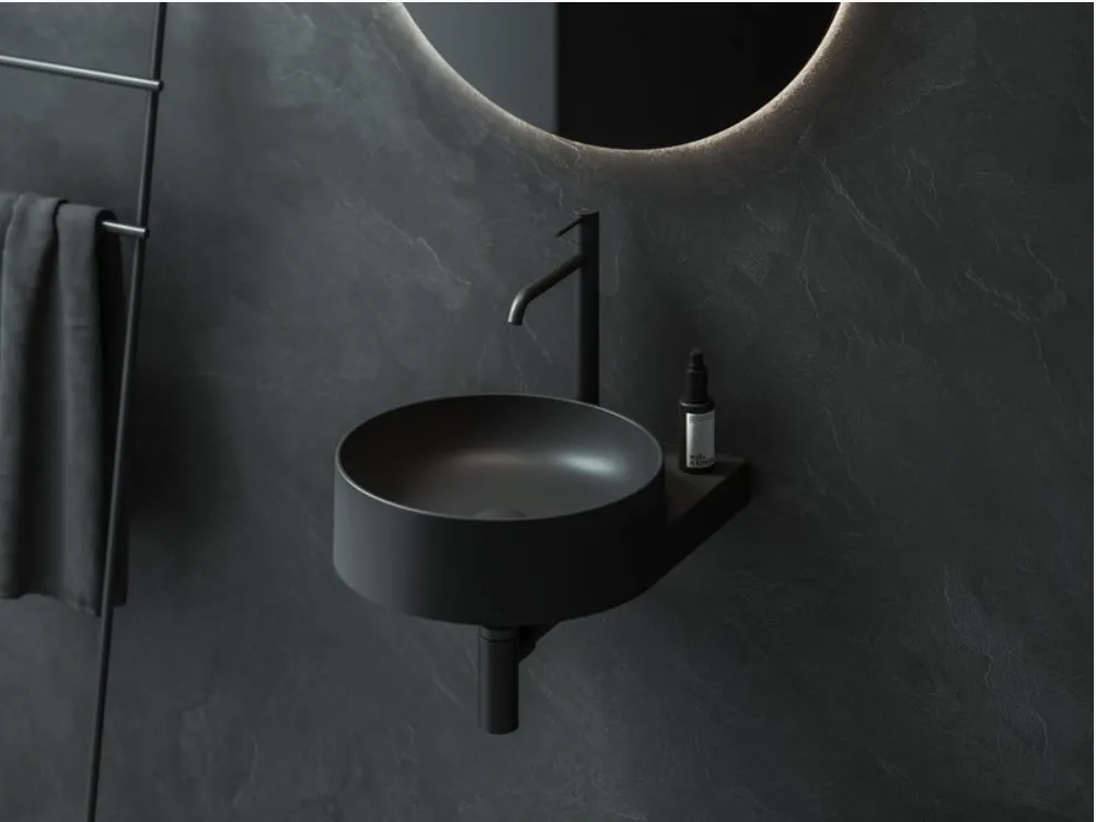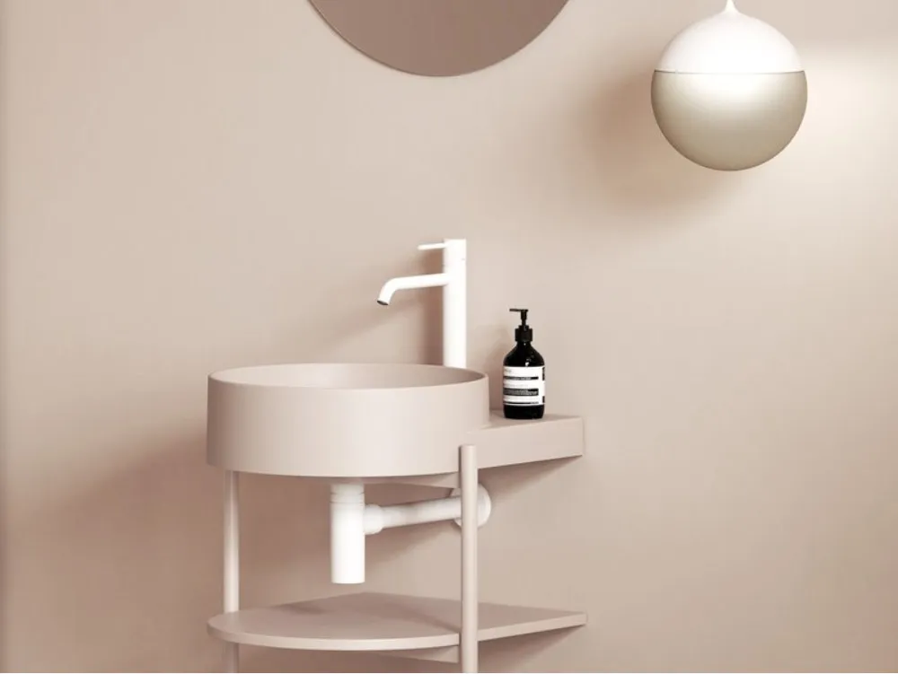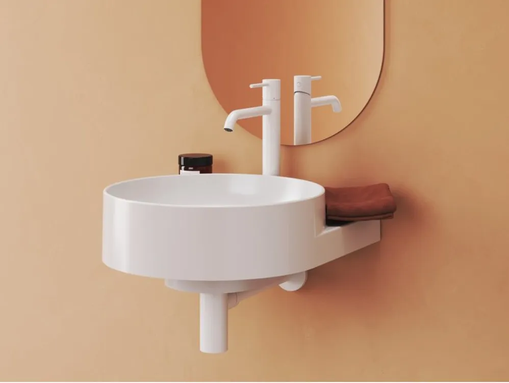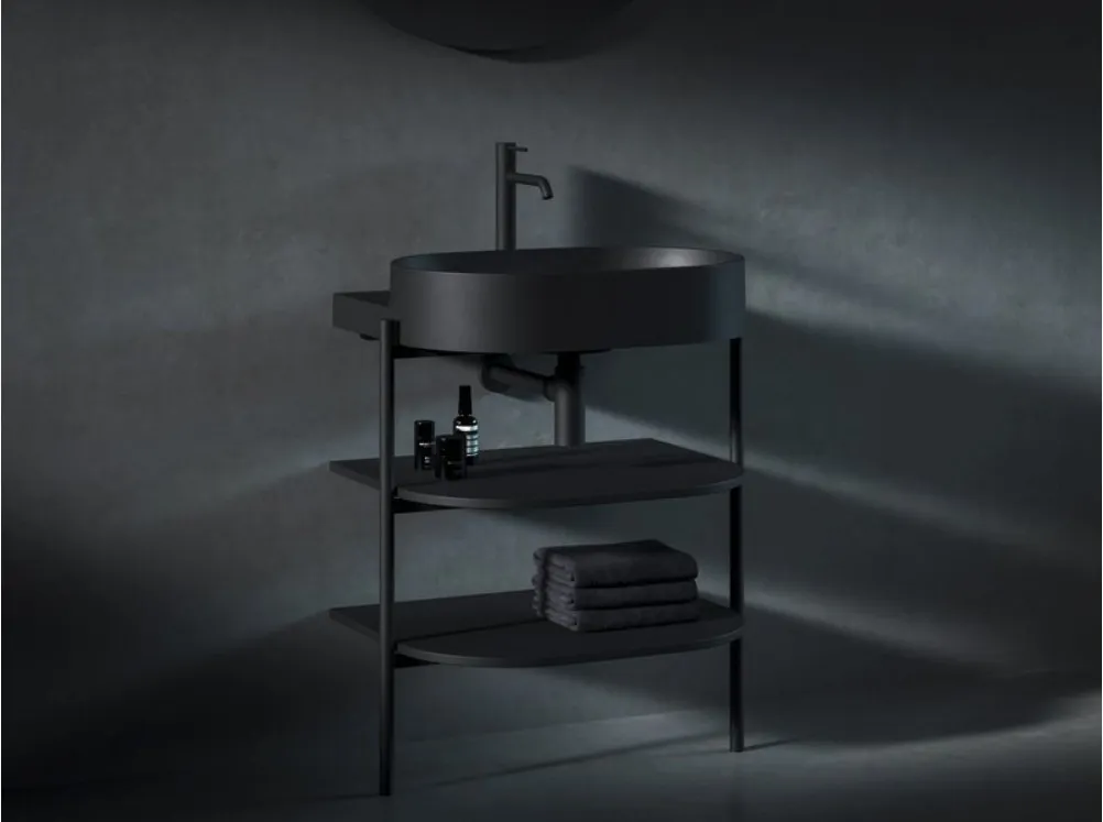 Круглый умывальник дополняется элементом дизайна в виде кронштейна белого/черного цвета или из нержавеющей стали. Магия элегантности объединяет в один тон сочетание консоли, смесителя, сифона и слива.