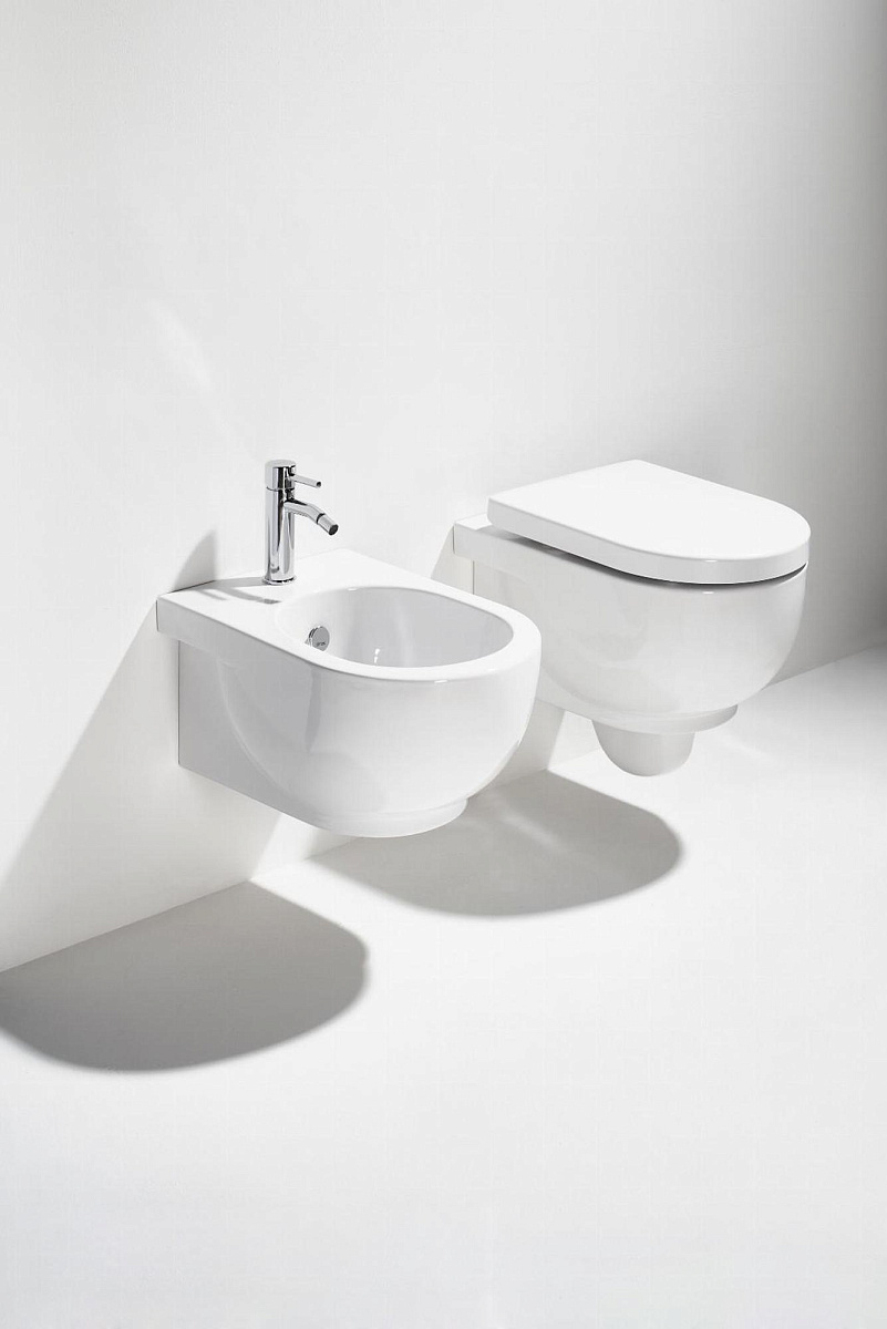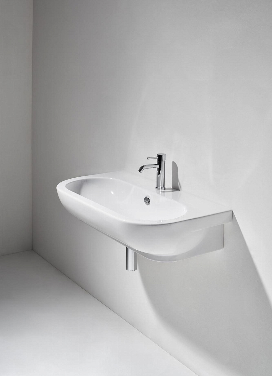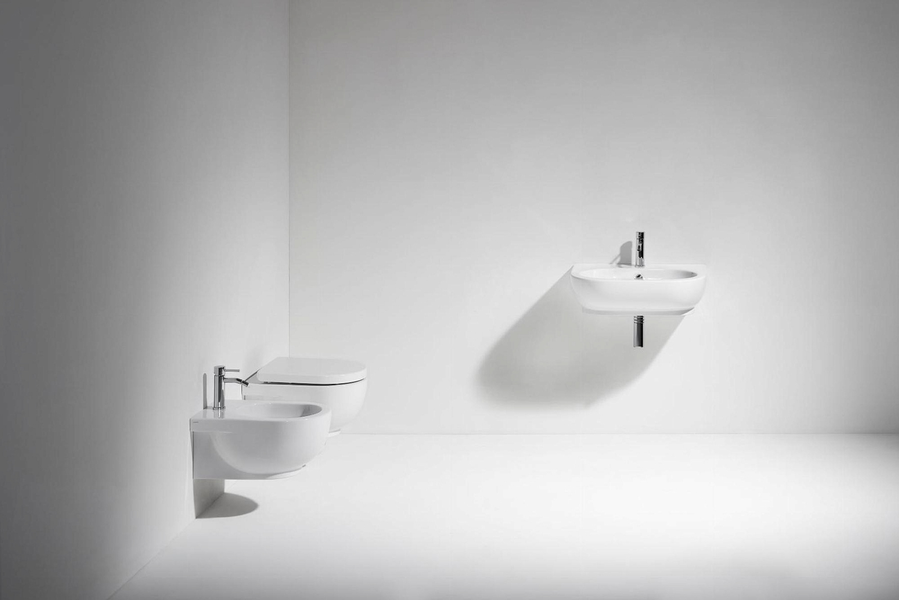 Коллекция для ванной комнаты с мягкими и плавными линиями, разработанная для мебели в современном стиле. Подвесные или напольные умывальники разных размеров. Напольные или подвесные вазы и биде, в том числе моноблочные.
