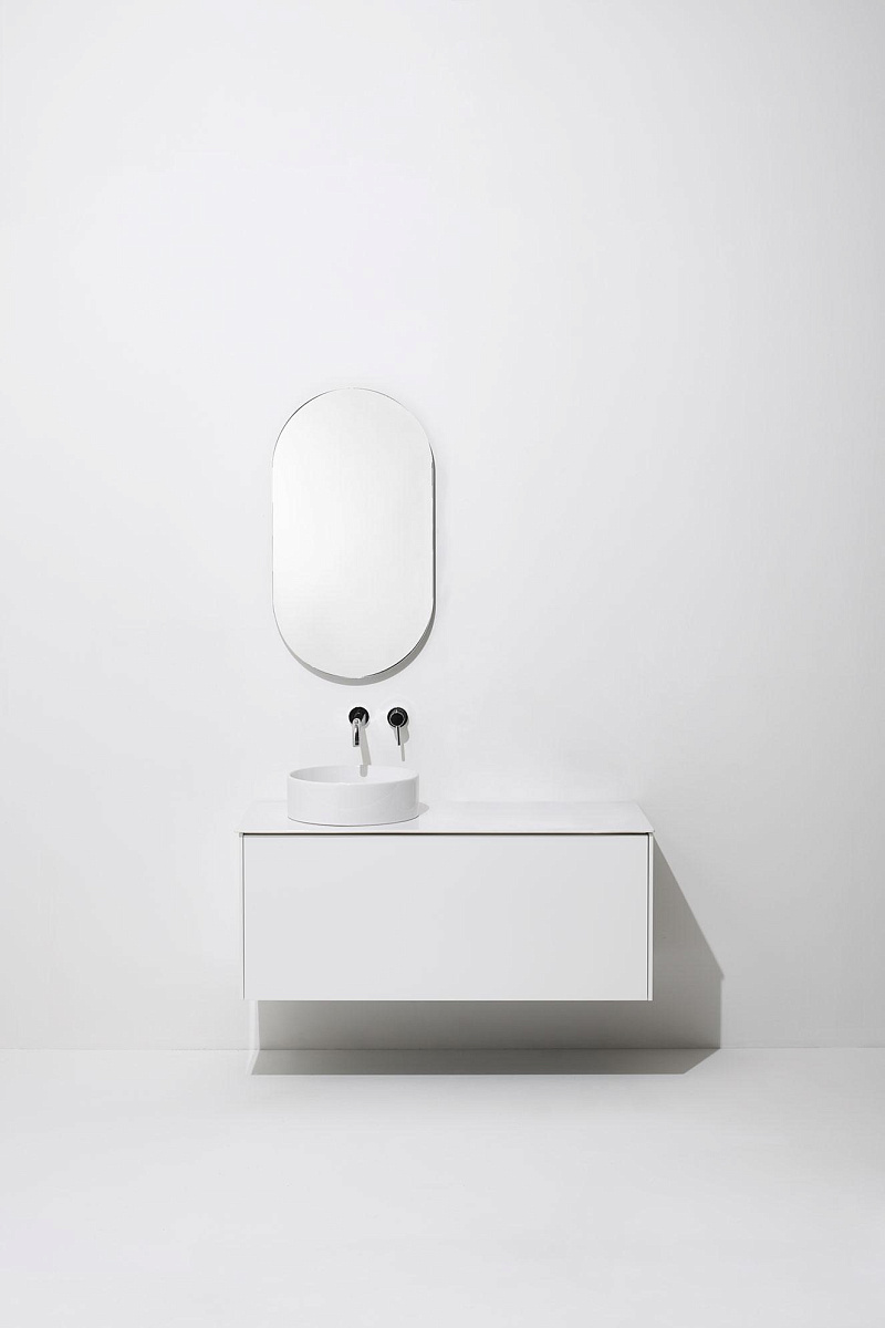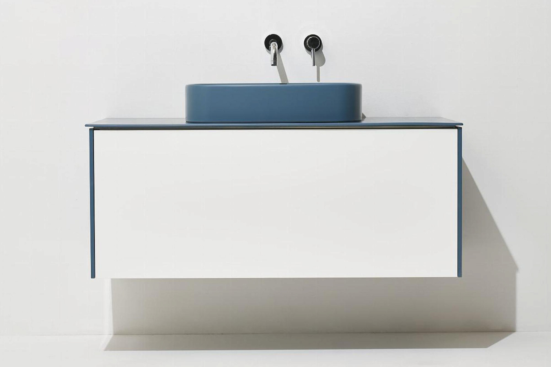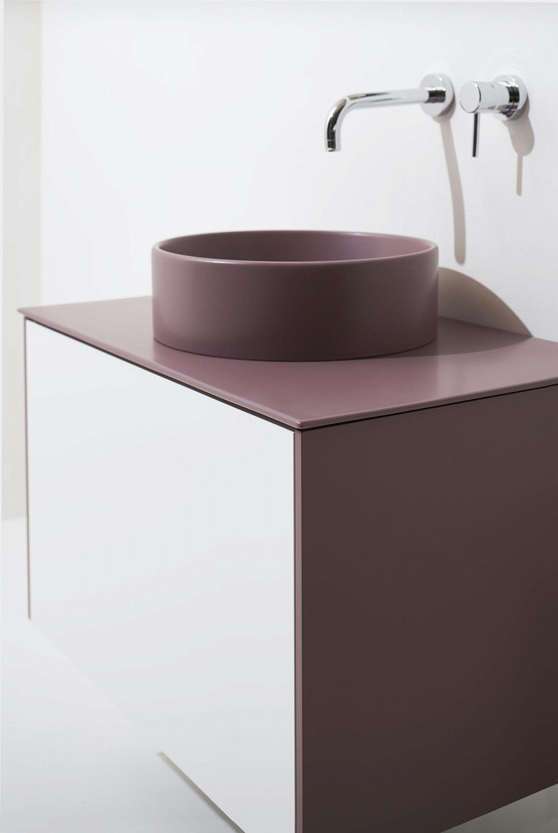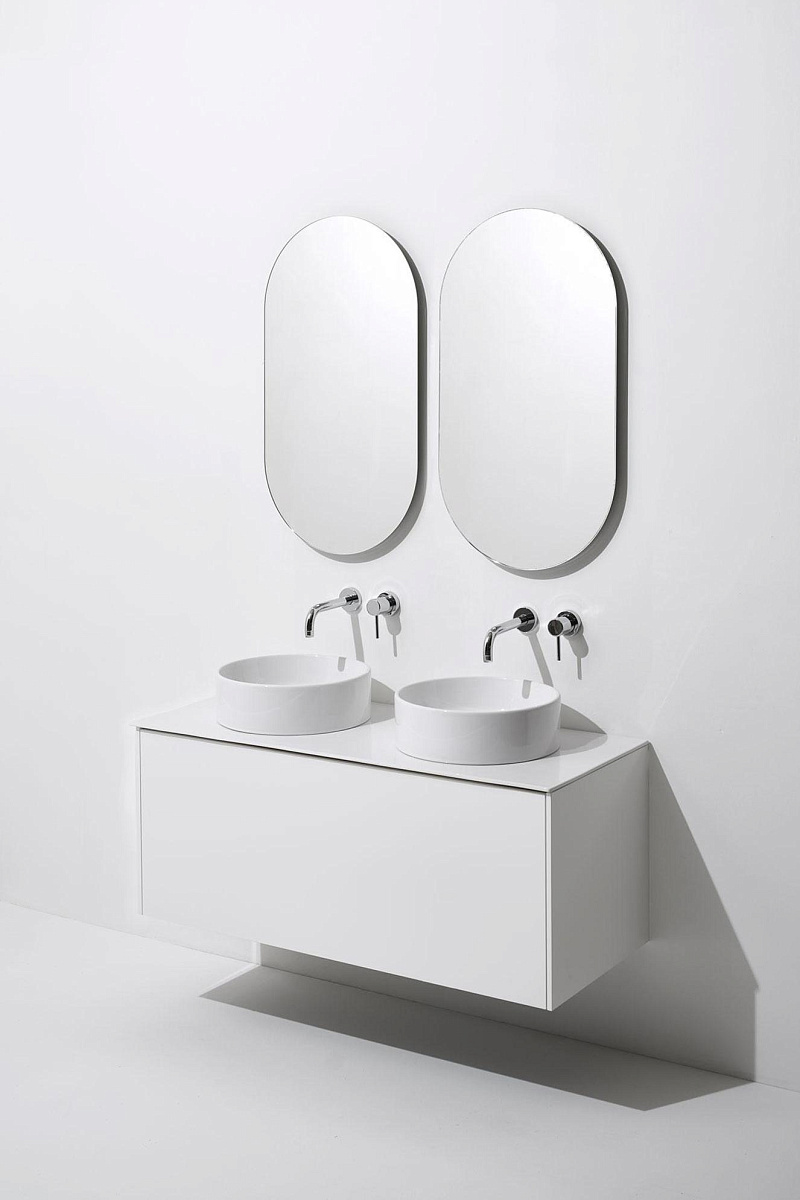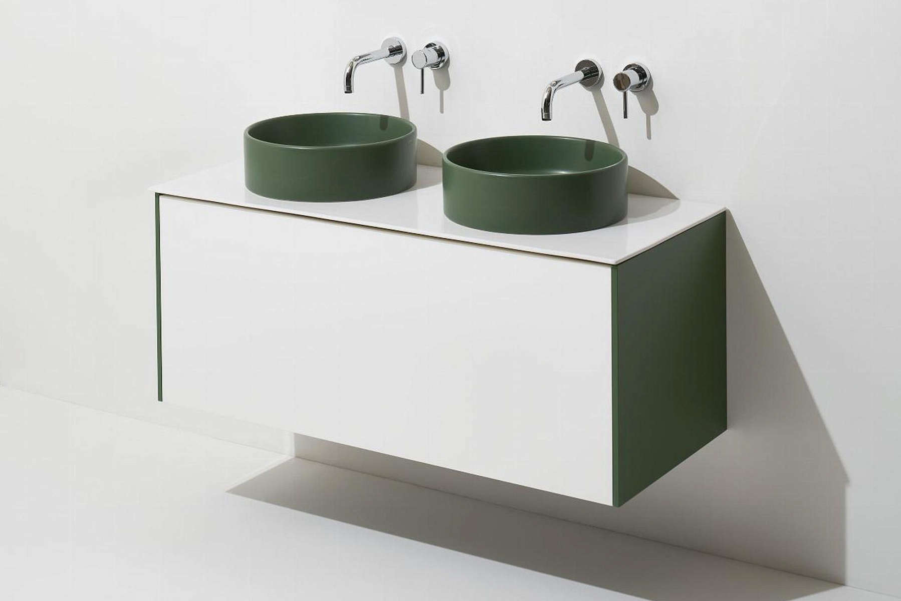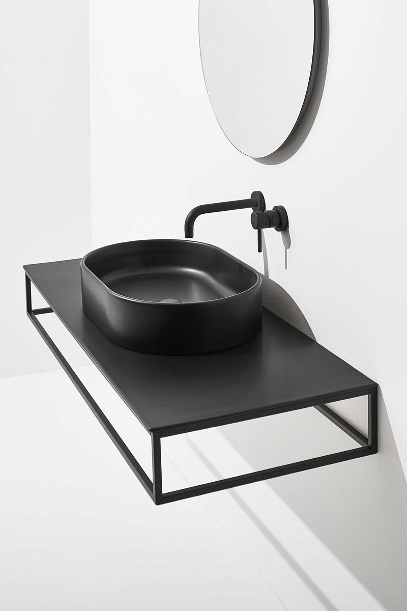 Керамика выходит из своих привычных границ, чтобы стать тонкой столешницей, опорой для четырех раковин.