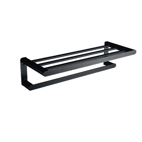 Полка для полотенец черная с настенными креплениями в комплекте. Аксессуар изготовлен из алюминия, что обеспечивает легкий монтаж, а также долгий срок службы