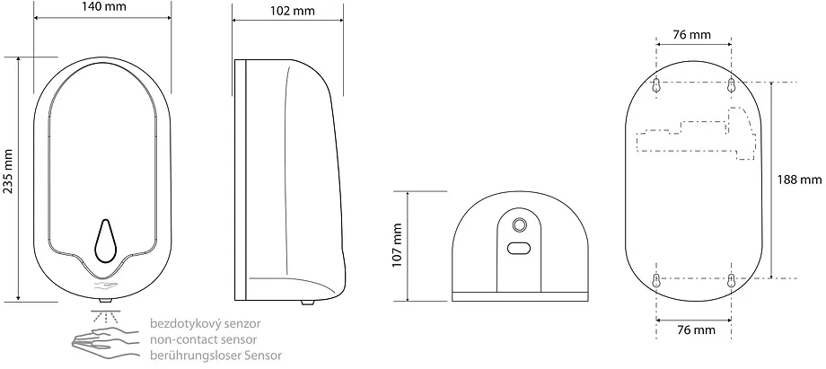 Автоматический диспенсер жидкого мыла. Объем дозатора 1200 мл. Материал: черный пластик.