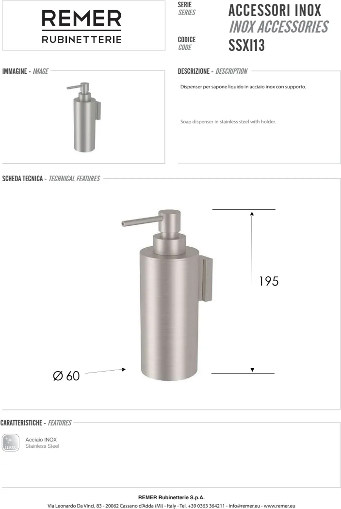 Дозатор Remer INOX accessories Дозатор нержавеющая сталь SSXI13