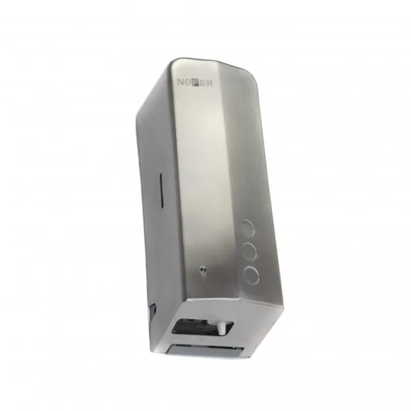 Nofer 03039.S дозатор для жидкого мыла автоматический, сенсорный из нержавеющей стали AISI 304, матовый. Дозатор работает от 6 батареек АА, также данный дозатор может работать от электрической сети, для этого потребуется докупить электрический адаптер. Дозатор будет выделять 0,8-1 мл жидкого мыла за 1 цикл работы. Для качественной работы устройства, необходимо расположить его на уровне не менее 20 см от поверхности. Корпус дозатора считается антивандальным, поскольку изготовлен из нержавеющей стали толщиной 1,0 мм и не имеет острых углов. Также устройство поставляется в комплекте с универсальным ключом и монтажным набором, батарейки с дозатором не поставляются. Рекомендуется использование расходных материалов средней вязкости, уровень РН которых находится в диапазоне нейтральной от 6 до 8. Также данный диспенсер можно использовать совместно с мылом-пеной. Для этого потребуется докупить специальный клапан.