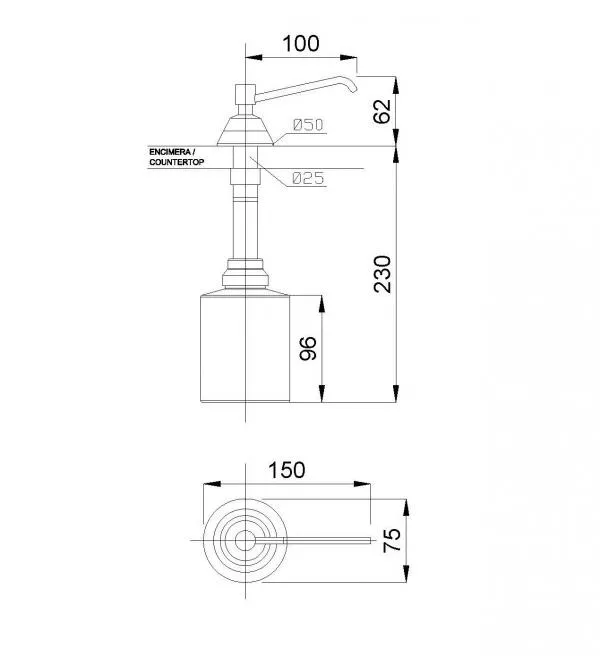 Размеры кнопки: 62 высота x 50 ширина x 100 глубина (мм). Размеры бутылки: 96 высота x Ø75 (мм). Необходимый диаметр отверстия в столешнице: Ø25 мм