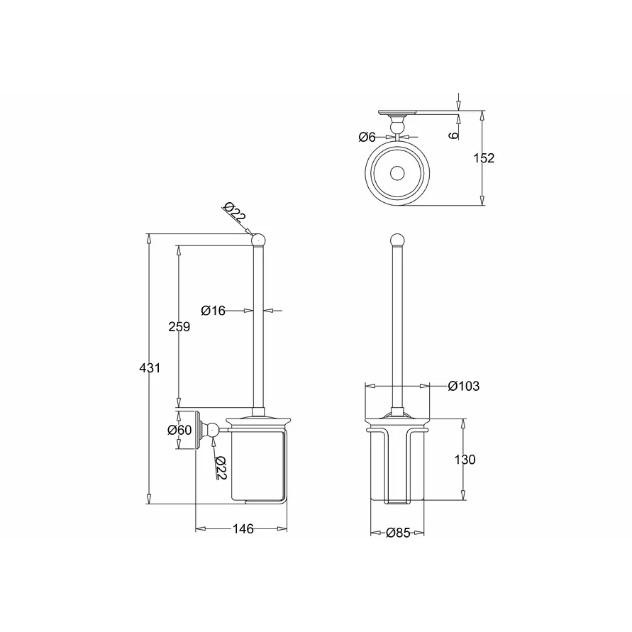 Эта колба с ершиком крепится к стене, освобождая площадь пола. Золотистая ручка и держатель будут удачно смотреться с другими элементами, выполненными под золото.