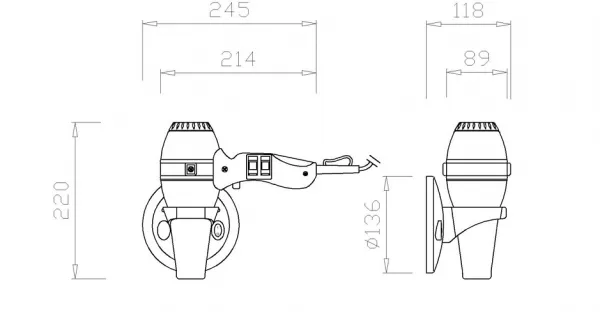 Профессиональный фен для волос пистолетного типа. Настенный кронштейн. Данный аппарат имеет 2 режима которые регулирует скорости потока воздуха и 2 режима регулировки температуры воздуха. . Корпус фена выполнен из ABS пластика и хромированной стали. Прекрасно подойдёт для гостиниц, отелей и салонов красоты
