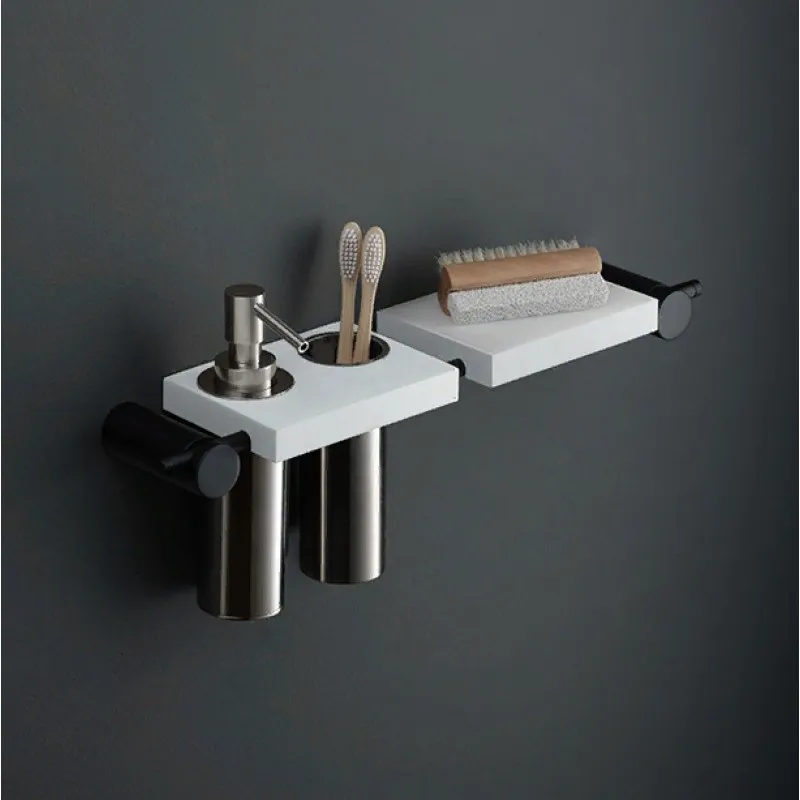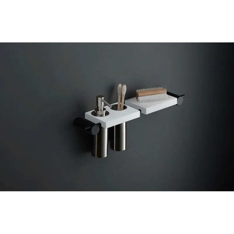 - комплект: держатель с креплением, полка-мыльница, полка с 2 отверстиями, стакан и дозатор