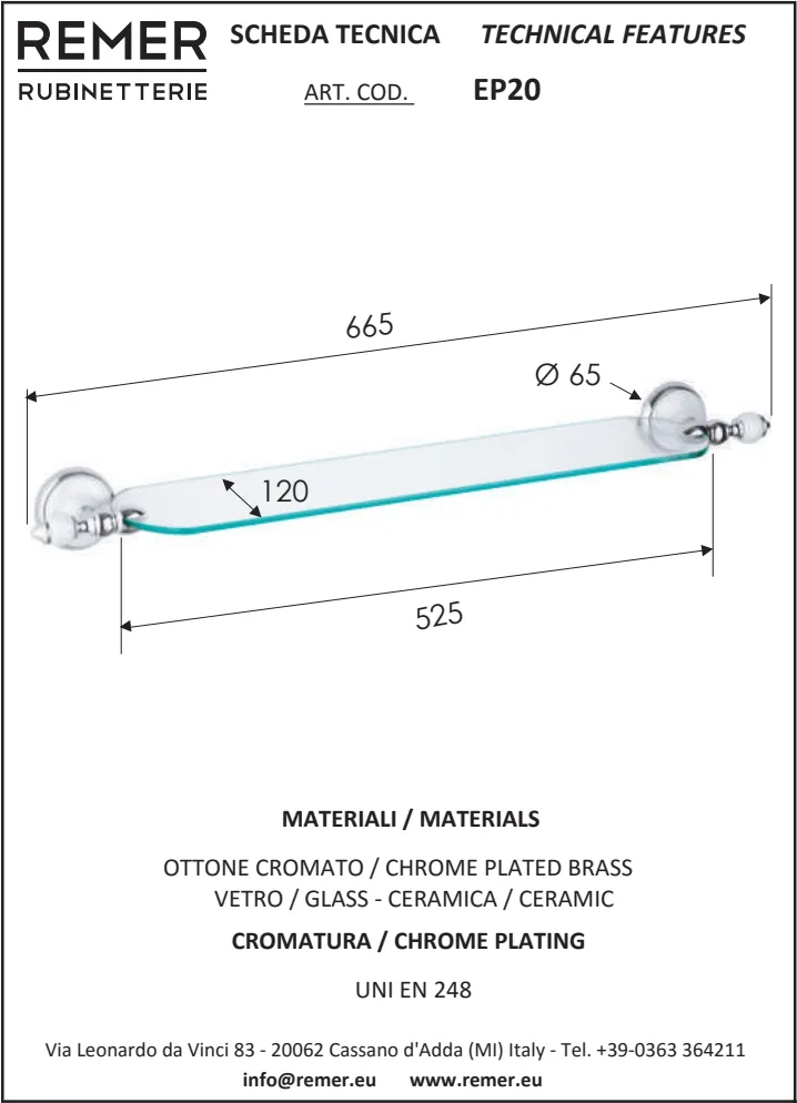 Стеклянная полка с держателем на стену из хромированной латуни и керамики