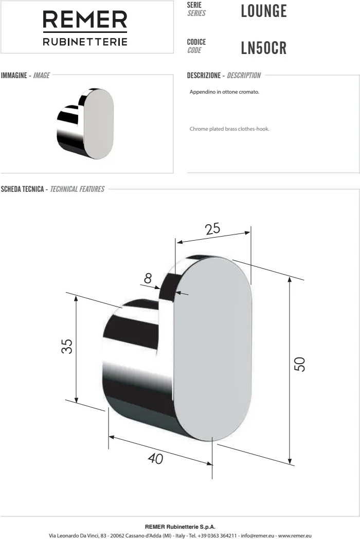 Крючок Remer Lounge хром (CR) LN50CR Крючок Remer Lounge хром (CR) LN50CR