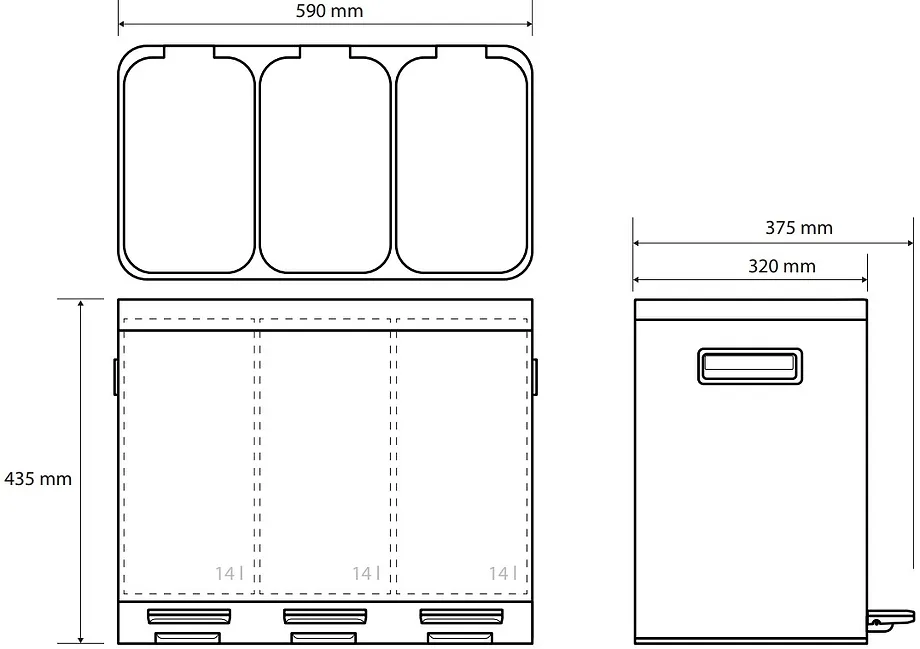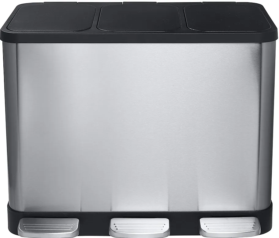 Контейнер для сортировки мусора на три отделения. Каждое отделение объемом 14 литров. Цвет контейнера: матовая нержавеющая сталь.