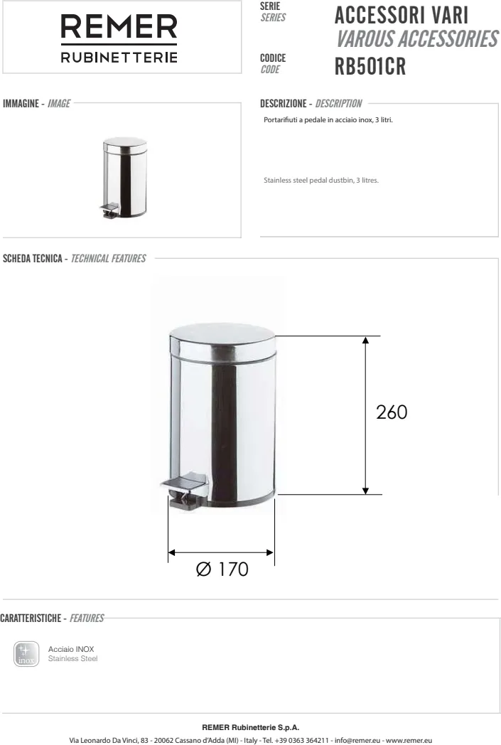 Мусорный бачок для ванной комнаты, 3 литра из нержавеющей стали