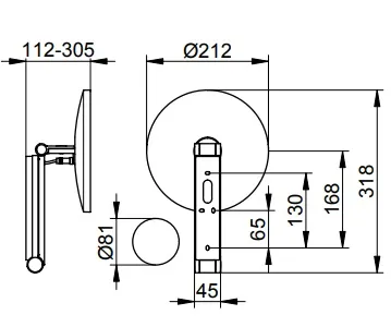 - конструкция: поворотная (регулируется в трех плоскостях), на кронштейне с шарниром, без подсветки, фактор увеличения х 5, вогнутое, одностороннее