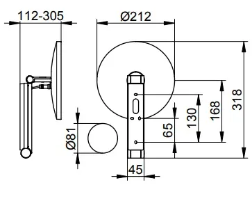 С подсветкой, 1 цвет подсветки 6500 Кельвин (дневной свет), включение с помощью выключателя рычажного типа, настенная модель на кронштейне с шарниром, регулируется в трех плоскостях, одностороннее зеркало, вогнутое, коэфффициент увеличения x 5