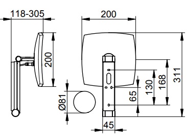 - конструкция: настенная модель, поворотная (регулируется в трех плоскостях), на кронштейне с шарниром, с выключателем рычажного типа, с подсветкой (1 цвет - дневной) 6500 Кельвин), коэффициент увеличения х 5, вогнутое, одностороннее