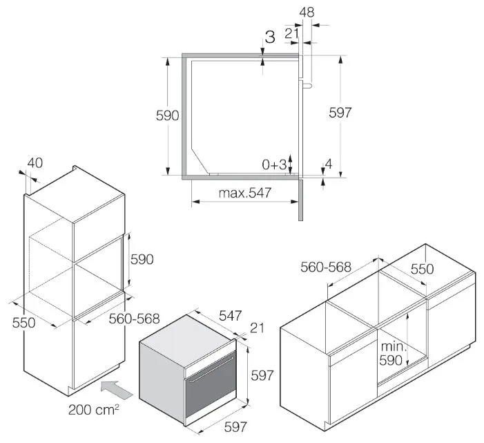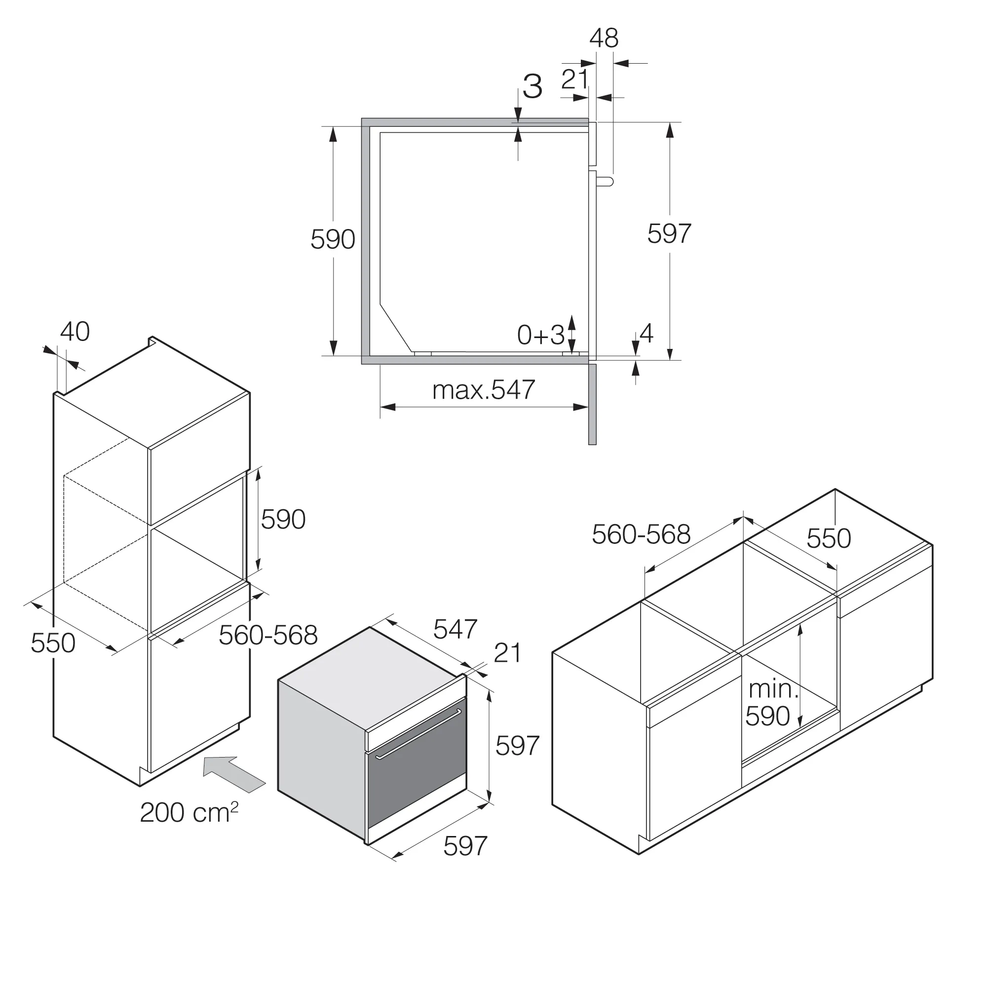 Перед монтажом убедитесь, что ниша соответствует размерам 59 × 56–56.8 × 55 см. Подключение духовки мощностью 3.40 кВт рекомендуется выполнять через выделенную линию электропитания. Благодаря классу A+ вы экономите энергию при каждом использовании. Система тангенциального охлаждения и четырёхслойное остекление дверцы обеспечивают безопасность эксплуатации.