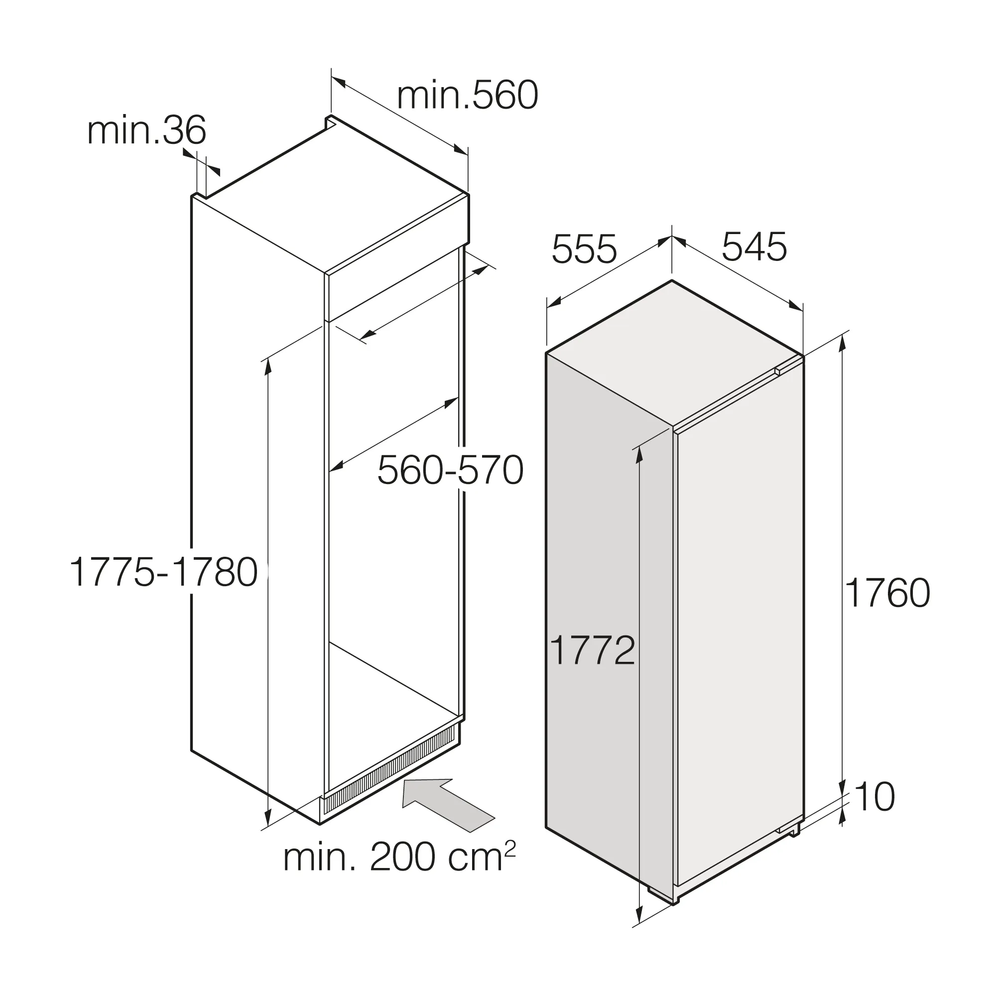 Размеры ниши для установки составляют 177.5–178 × 56–57 × 56 см, что делает модель совместимой с большинством стандартных кухонных шкафов. Встраиваемый холодильник Asko R31831I легко интегрируется в интерьер и обеспечивает аккуратный, минималистичный внешний вид.