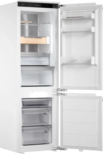 Встраиваемый комбинированный холодильник Asko RBC576DNC1 — это современное решение для тех, кто ценит функциональность, стиль и комфорт. Модель выполнена в элегантном белом цвете и идеально подходит для встраивания в стандартную кухонную нишу. Благодаря системе Door-on-Door фасад кухонного шкафа крепится прямо к двери холодильника, создавая единое визуальное пространство без выступающих элементов. Общий объем устройства составляет 242 литра: 167 л приходится на холодильную камеру и 75 л — на морозильную зону в нижней части. Такое распределение обеспечивает удобный доступ как к свежим продуктам, так и к замороженным запасам.