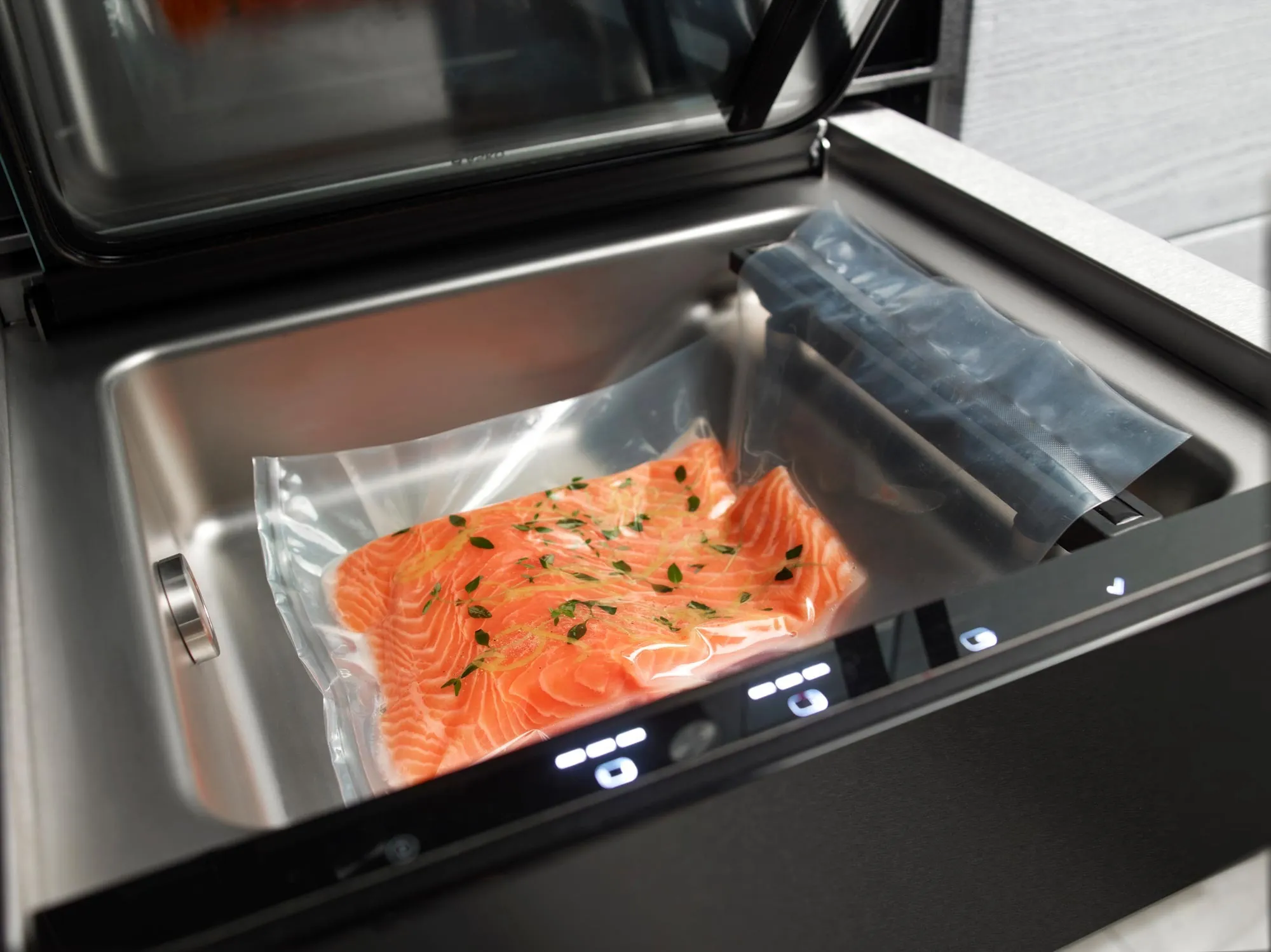 Для установки вакууматора требуется ниша размером 14 × 56 × 55 см. Внутренняя камера изготовлена из термостойкой нержавеющей стали, устойчива к механическим повреждениям и легко очищается. Телескопические направляющие с фиксацией обеспечивают плавное движение и безопасное использование. Объём камеры — 8 литров, а оптимальные габариты позволяют комфортно разместить устройство даже в компактной кухне. Уровни запайки и вакуумирования настраиваются индивидуально под тип продукта, обеспечивая сохранение вкуса и текстуры.