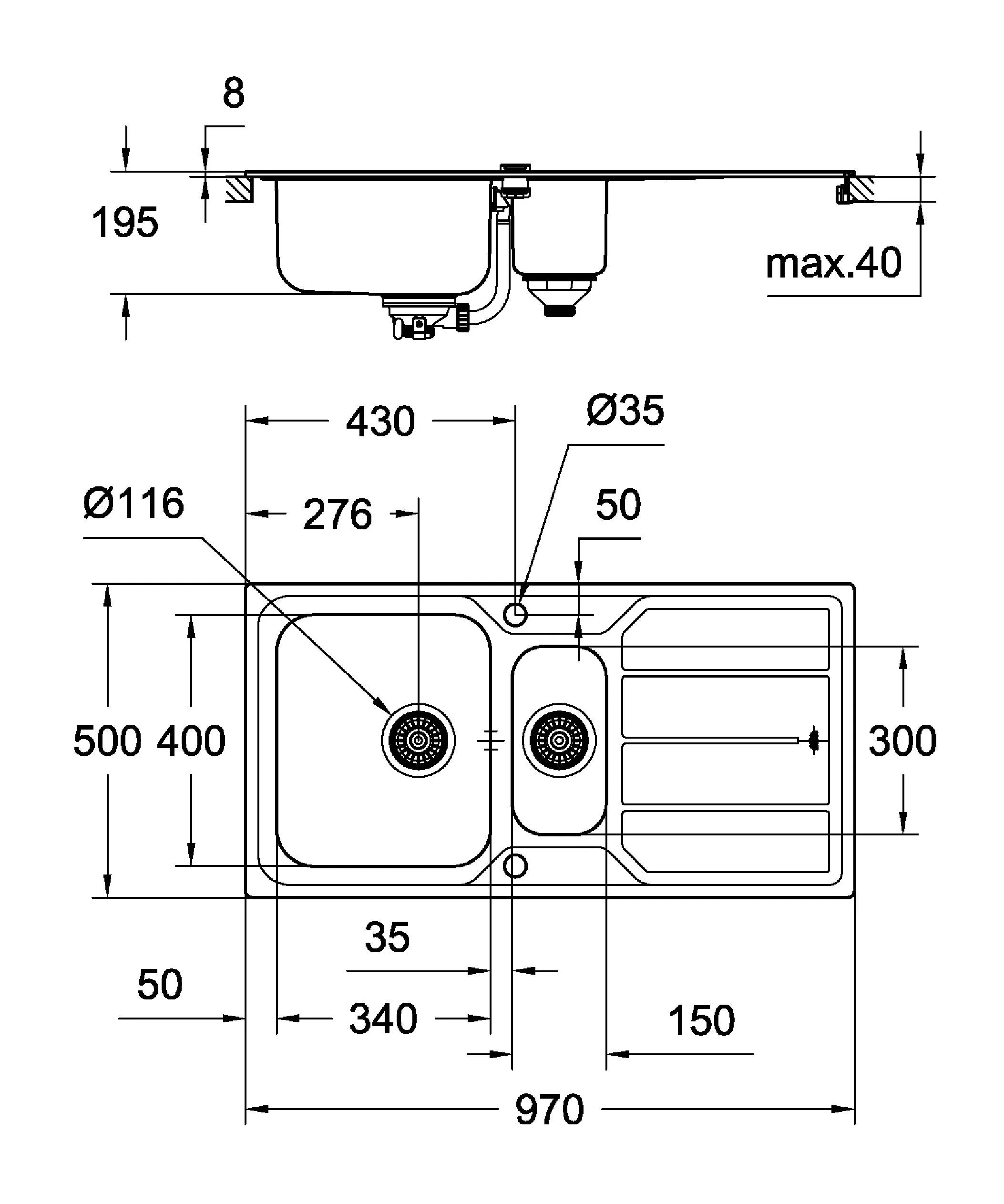 требуемый размер отверстия в столешнице для установки мойки: 950 x 480 мм