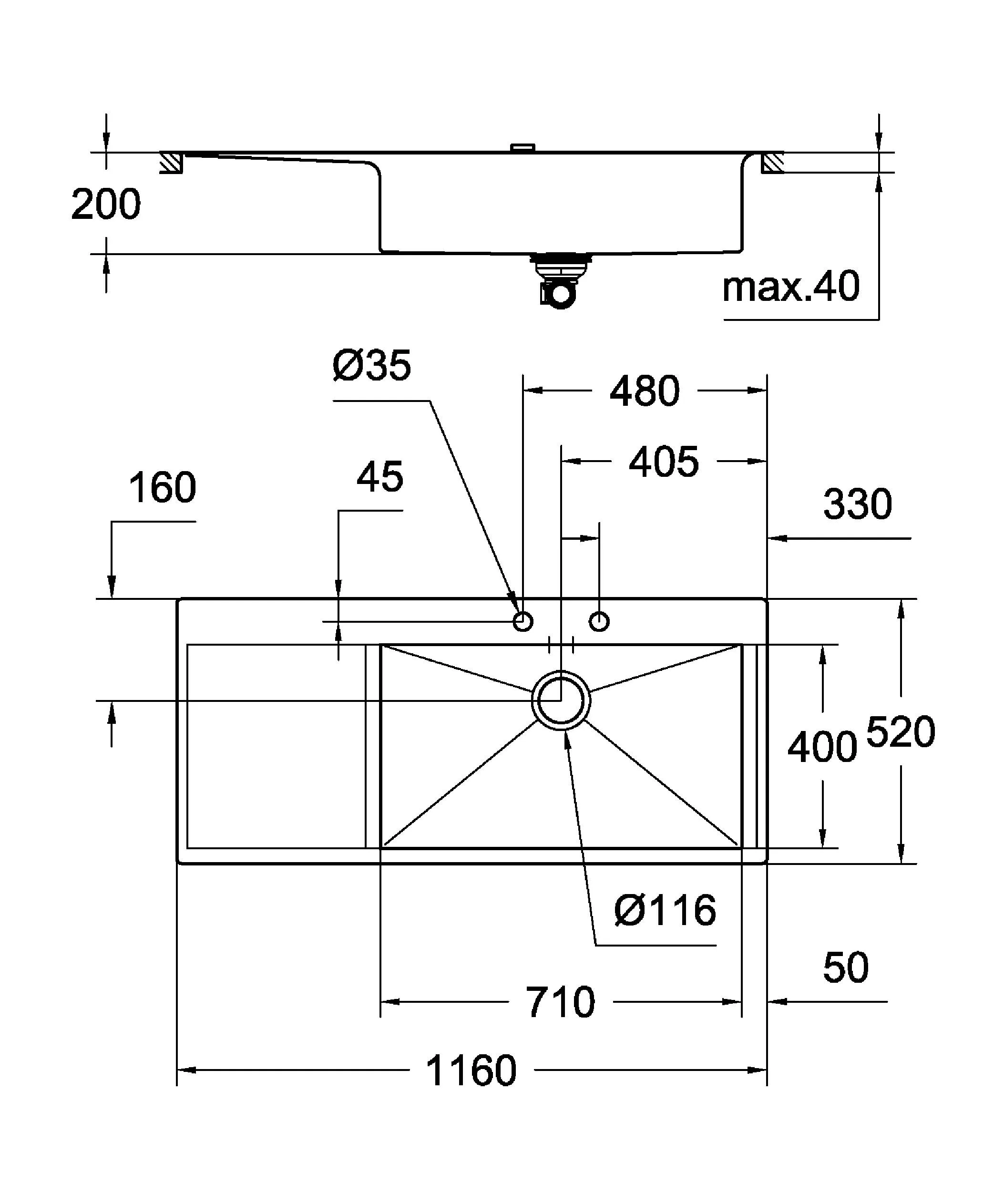 требуемый размер отверстия в столешнице для установки мойки: 1148 x 508 мм
