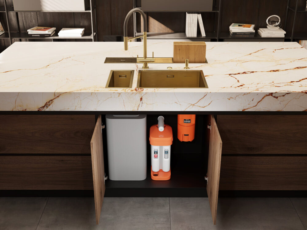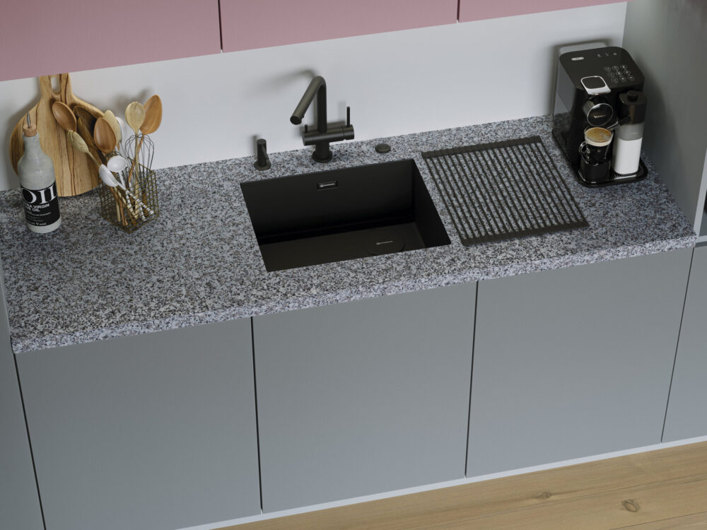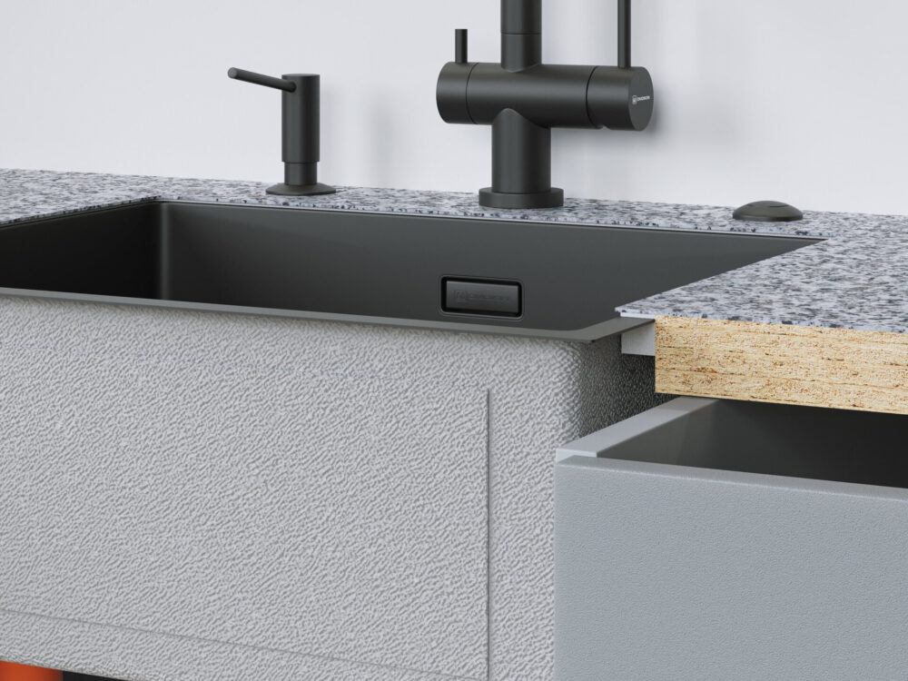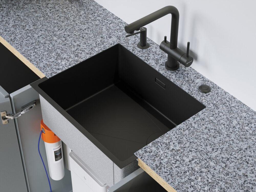 Отличительной особенностью этой модели является выпуск, размещенный сбоку от мойки. Такой дизайн позволит освободить место под мойкой для эргономичного размещения системы хранения, фильтра, измельчителя и других элементов.