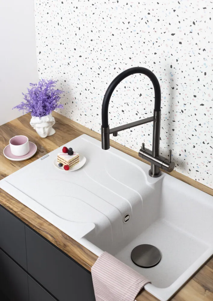 Мойки из Tetogranit устойчивы к механическим повреждениям. Кварцевый песок в составе мойки имеет кристаллическую структуру, гарантируя неизменность внешнего вида мойки и ее безопасность. За счет плотной структуры материала мойки имеют гладкую и ровную поверхность, с которой легко убираются загрязнения при помощи обычной влажной губки.