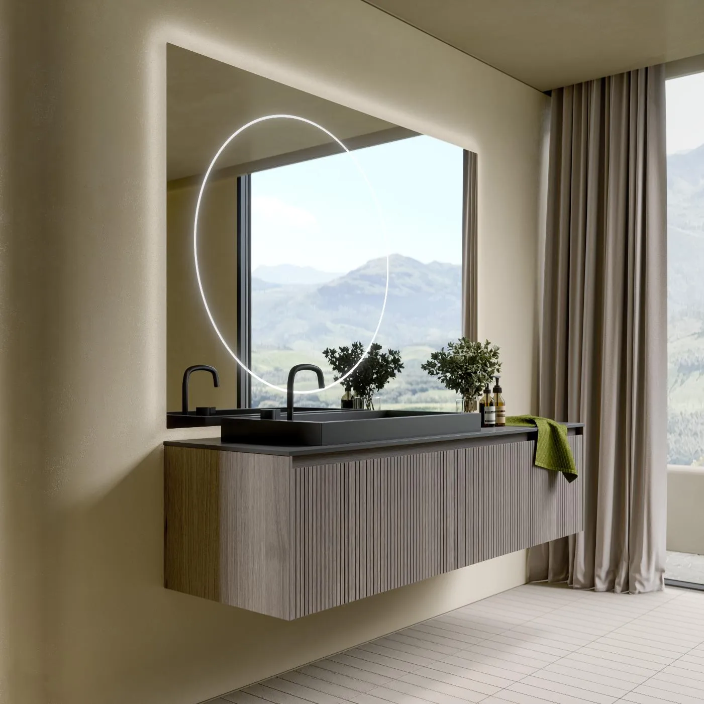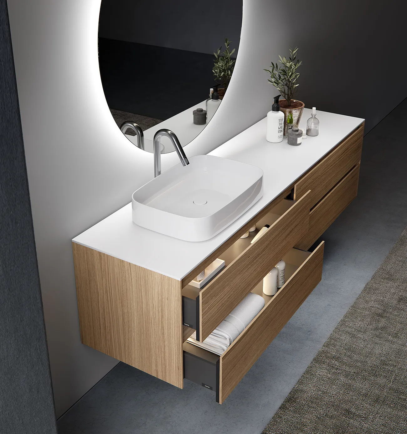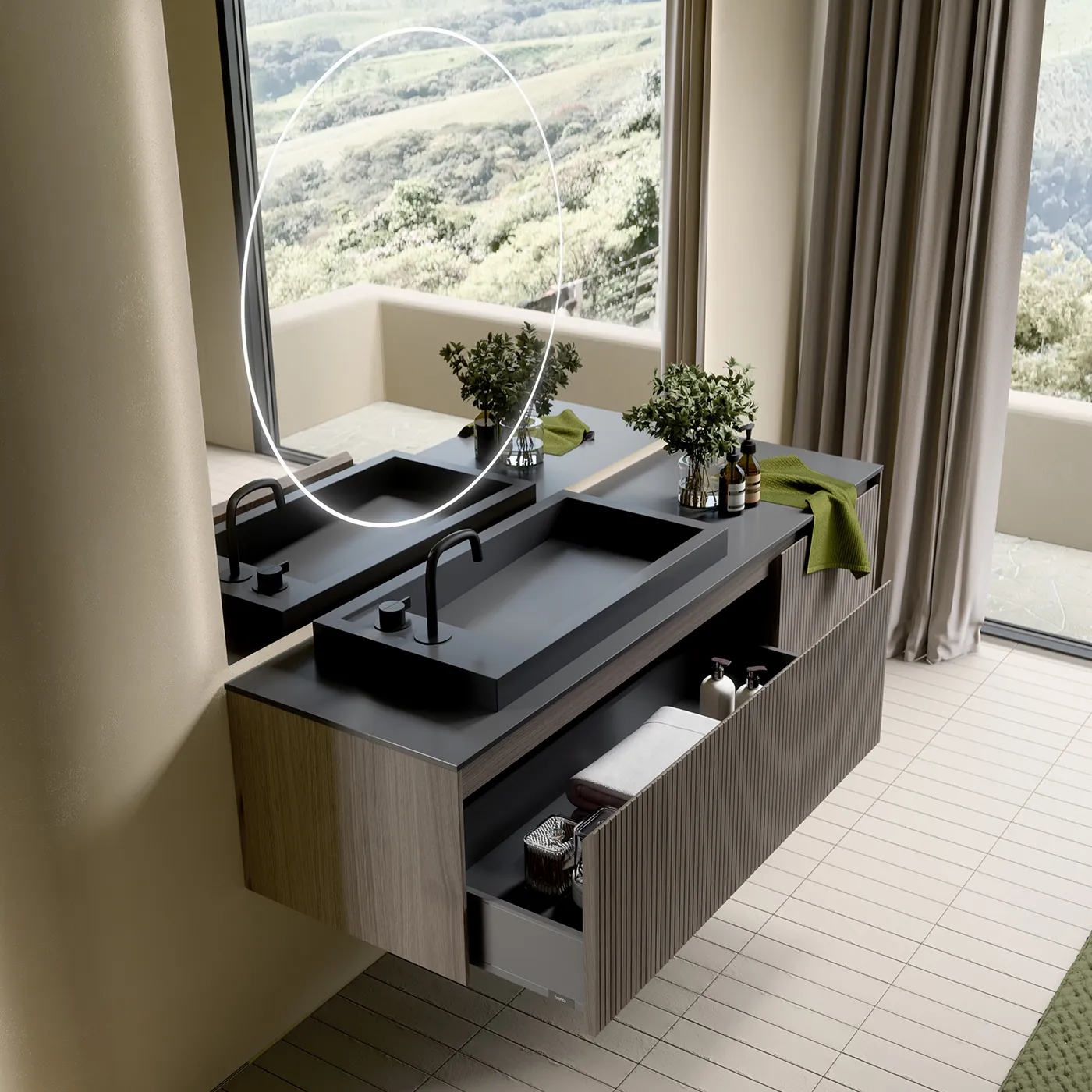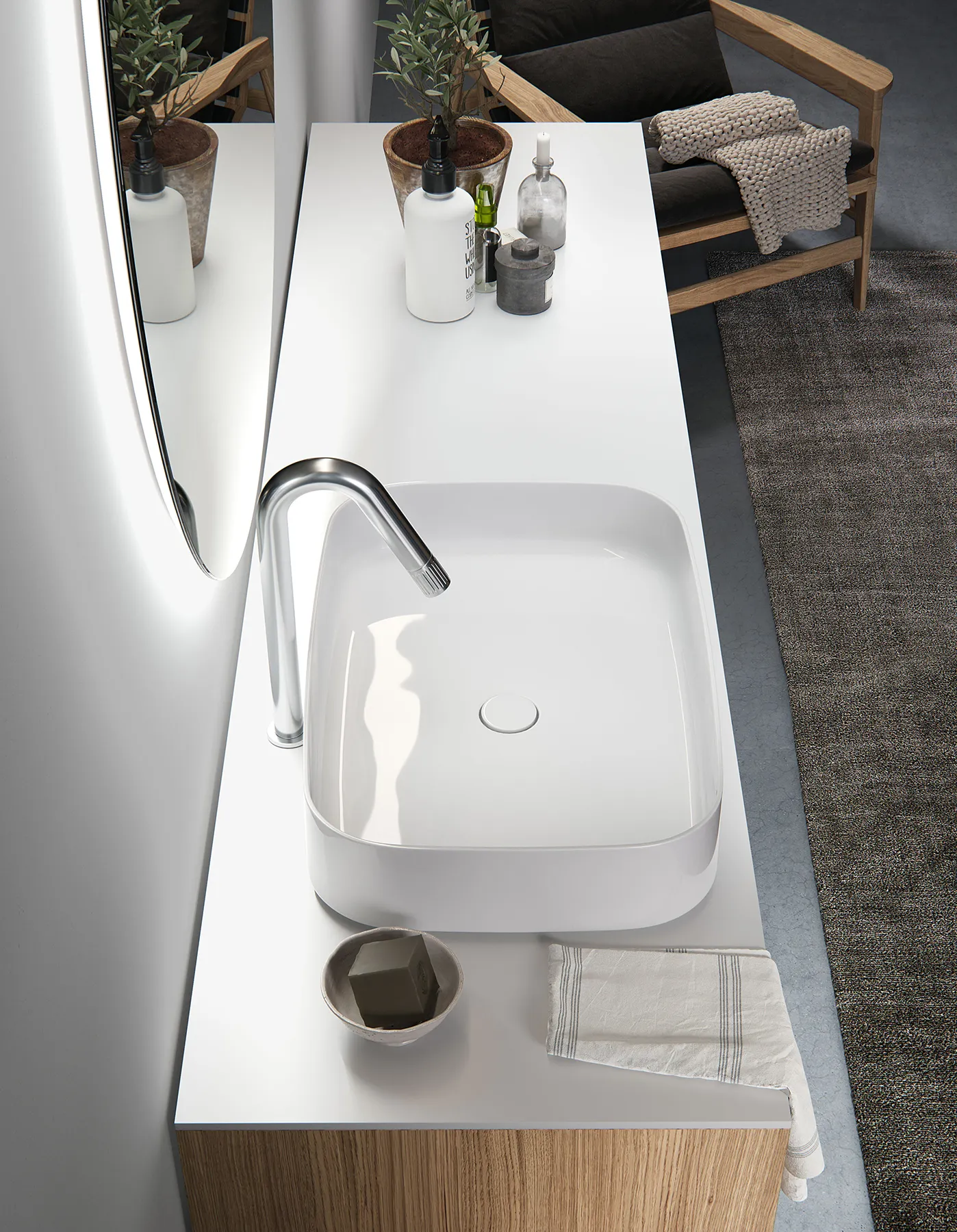 Fly сочетает в своем облике элегантную строгость и бескомпромиссную функциональность. Благодаря разнообразному набору элементов, вариативному размерному ряду и богатому предложению отделок и цветов Вы получаете многогранную, но в тоже время универсальную коллекцию для создания современного интерьера ванной комнаты. Изящные фасады и боковины толщиной всего 10 мм мебели FLY эффектно подчеркивает столешница из 12 мм Solid surface. Помимо этого Вы можете выбрать столешницу из кварца, керамогранита, шпона либо крашенную под цвет мебели.