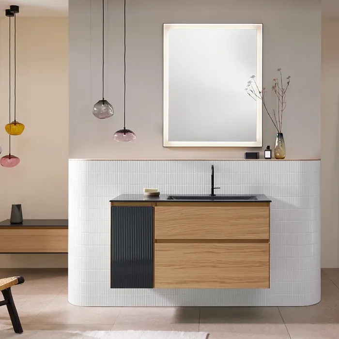 Burgbad Accura Комплект мебели 111.7х49х61.2см., 2 ящика, 1 стеклянная дверца слева Антрацит, в комплекте с черной матовой раковиной, цвет: Eiche natur SGVI111R F6077 C0038