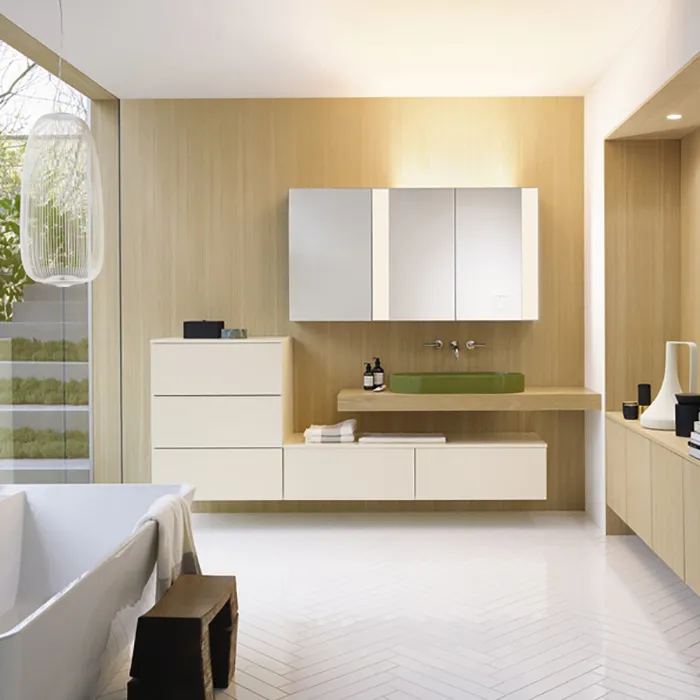 BURGBAD RC40 Комплект мебели 260см., столешница с раковиной RAL6013 Reed green, тумба с 5 ящиками, зеркальный шкаф с подсветкой, подвесной, цвет: Eiche Authentic/Champagner Hochglanz WPCR160.1506 F4110