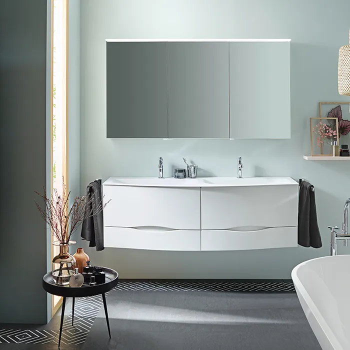 BURGBAD Sinea 2.0 Комплект подвесной мебели 151 см, база с 4 ящиками, двойная раковина из минерального литья цвет: белый с зеркальным шкафом с подсветкой, цвет: белый глянцевый SFFQ151 F2800 G0167 C0001*1