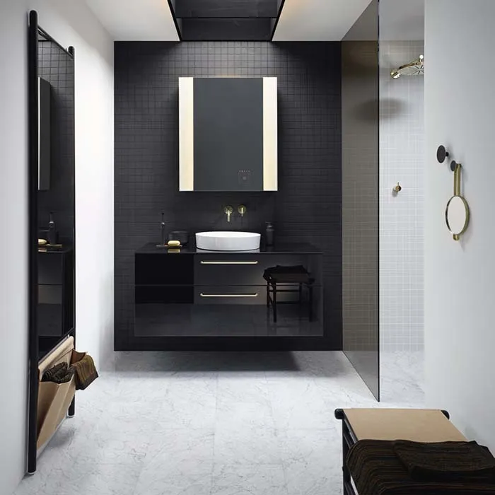 Burgbad Sys30 Комплект мебели №2, тумба с раковиной 120х54х48см., 2 ящика, ручки латунь, с зеркальным шкафом, зеркало напольное, скамья, подвесной, цвет: черный глянцевый WURY120 G0201 F2755