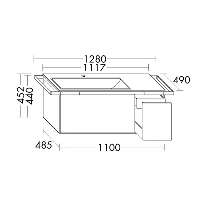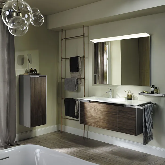 Burgbad Yso Комплект подвесной мебели 128x49x45 см, с прямоугольным керамической раковиной слева, с 2-мя полотенцедержателями, цвет: светло-серый глянцевый/фасада коньячный орех SFAC111 L K0396 F2321 C0001*1