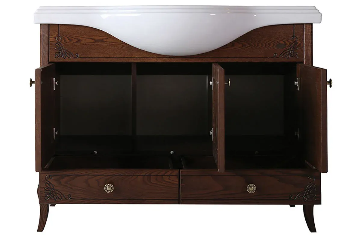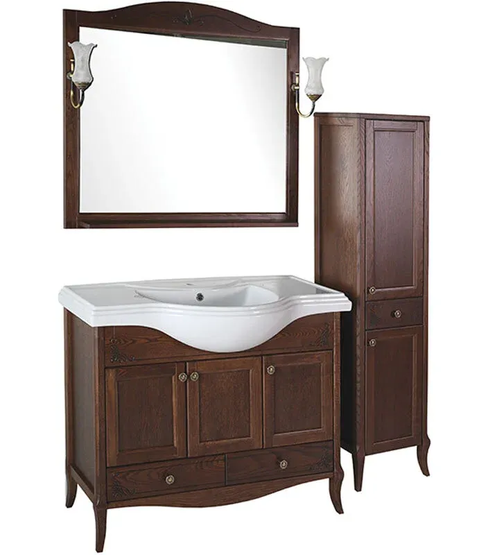 Если вы хотите приобрести удобный, функциональный и стильный набор для ванной комнаты, то комплект «Салерно 105» отлично вам подойдет. Мебель выполнена из массива натурального, экологически чистого ясеня в ореховом оттенке. Она отражает собой элегантность и классический итальянский стиль. Раковина сделана из керамики. Тумба снабжена выдвижными ящиками и створками, которые плавно закрываются с помощью доводчиков. Зеркало дополнено аккуратной полочкой и двусторонней подсветкой. Пользоваться комплектом — одно удовольствие.