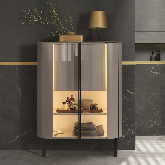 Шкаф напольный Burgbad Lavo 2.0 101х41х136.5см., 2 стеклянных двери, 1 полка, 1 внутр ящик, подсветка, ручки и ножки черные, цвет: Basaltgrau Mat