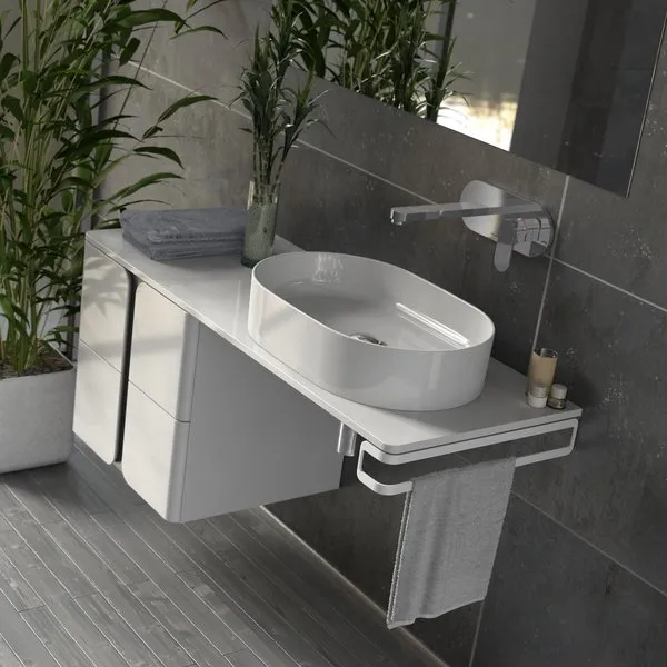 Если столешница устанавливается с одной подвесной тумбой, ее необходимо дополнительно укрепить с другой стороны с помощью кронштейна Balance / Comfort 1200. Под столешницей можно установить полотенцедержатель Balance белого цвета.