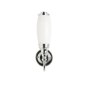 Особенность этого изысканного светильника-бра в необыкновенной форме абажура и оригинальных дизайнерских решениях. Матовый плафон, окаймленный хромированными полосками в тон деталям крепления, займет достойное место в любом уголке вашей ванной комнаты.