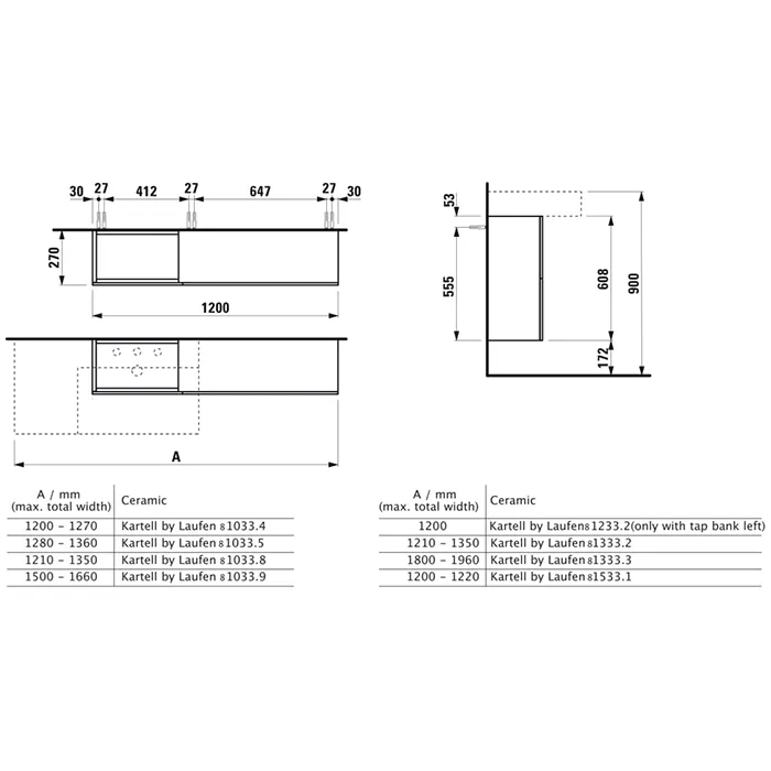 Laufen Kartell Тумба под раковину слева, 1200х270х610мм, с 1 дверцей и 2 створками, цвет: белый матовый