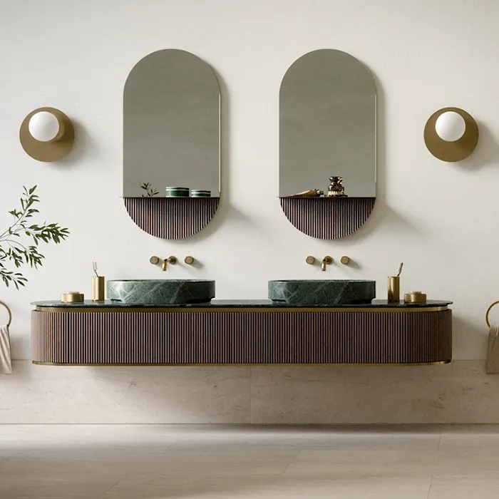 Тумба боковая округлой формы Oasis Naos 28x56x32 с 1 дверцей правой, золото матовое/ орех трубчатый 0NAOB9D001