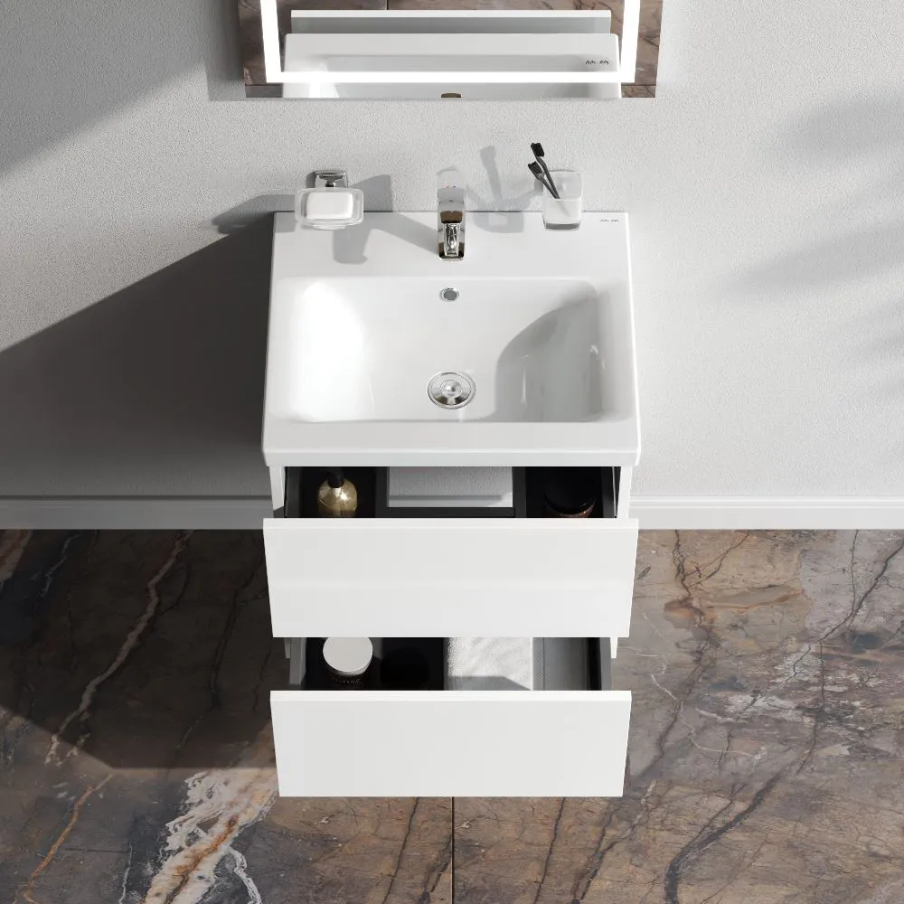 Подвесная тумба бренда AM.PM коллекции Gem идеально подойдет тем кто предпочитает минимализм в интерьере. Современный европейский дизайн от студии DanelonMeroni (Великобритания/Италия). Фурнитура push-to-open - открытие ящика легким нажатием на фасад. Два ящика с антискользящим покрытием цвета антрацит" – европейский стандарт. Материал корпуса и фасада - влагостойкий ЛДСП. Покрытие корпуса и фасада - высококачественные итальянские краски и эмали. Цвет тумбы – белый. Экологически чистые и удивительно долговечные полиакриловые эмали – специальная технология покраски в 7 слоев превосходит технологию нанесения автоэмали у ведущих немецких марок и обеспечивает насыщенный цвет в течение всего срока службы (от 10 лет). Размер (Ш/Г/В): 500x408x540