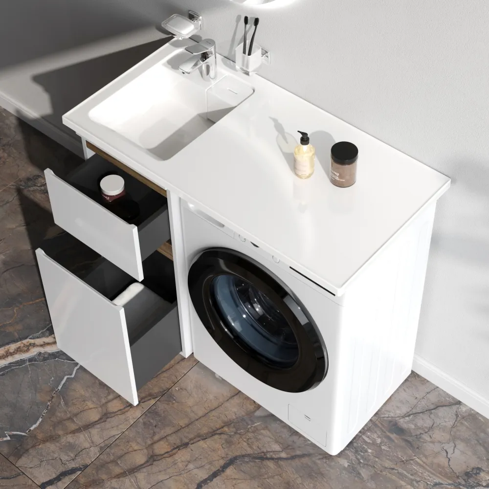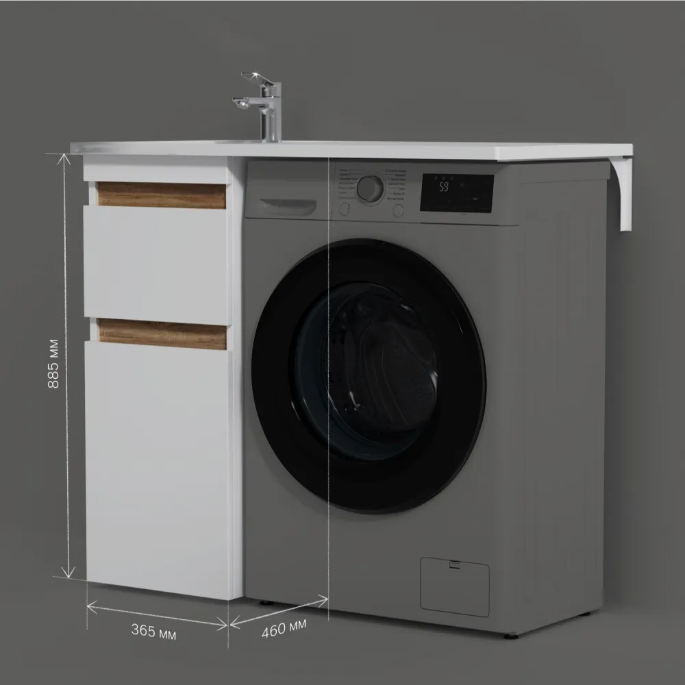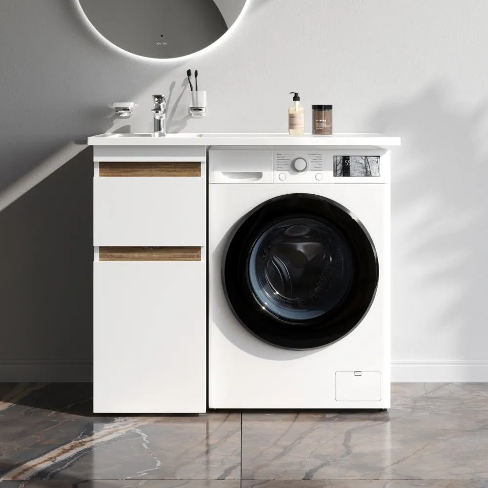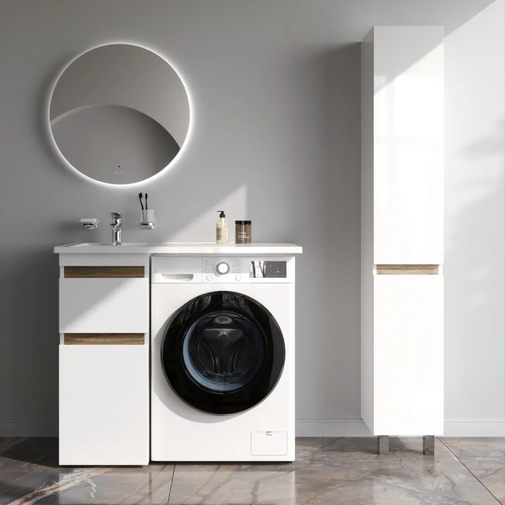 Долгожданное расширение в мебели X-Joy. Самое оптимальное и функциональное решение для организации пространства ванной комнаты с учетом размещения в ней стиральной машины. Подходит для интеграции с узкими стиральными машинами (глубиной от 32 до 45 см). Эстетичное сочетание цветов и фактур от дизайн-бюро Danelon Meroni (Великобритания & Италия): белые глянцевые фасады дополнены отделкой под светлое дерево.